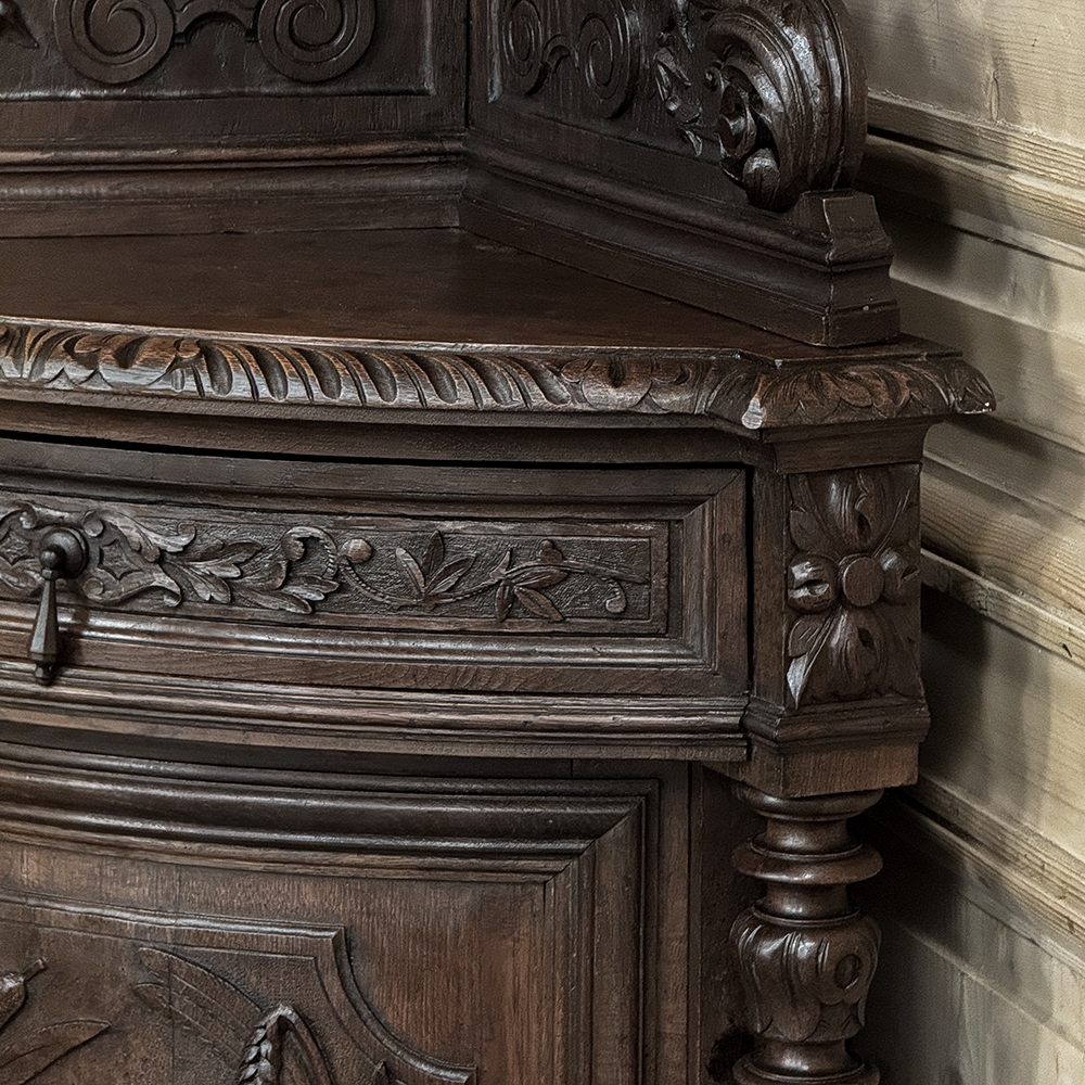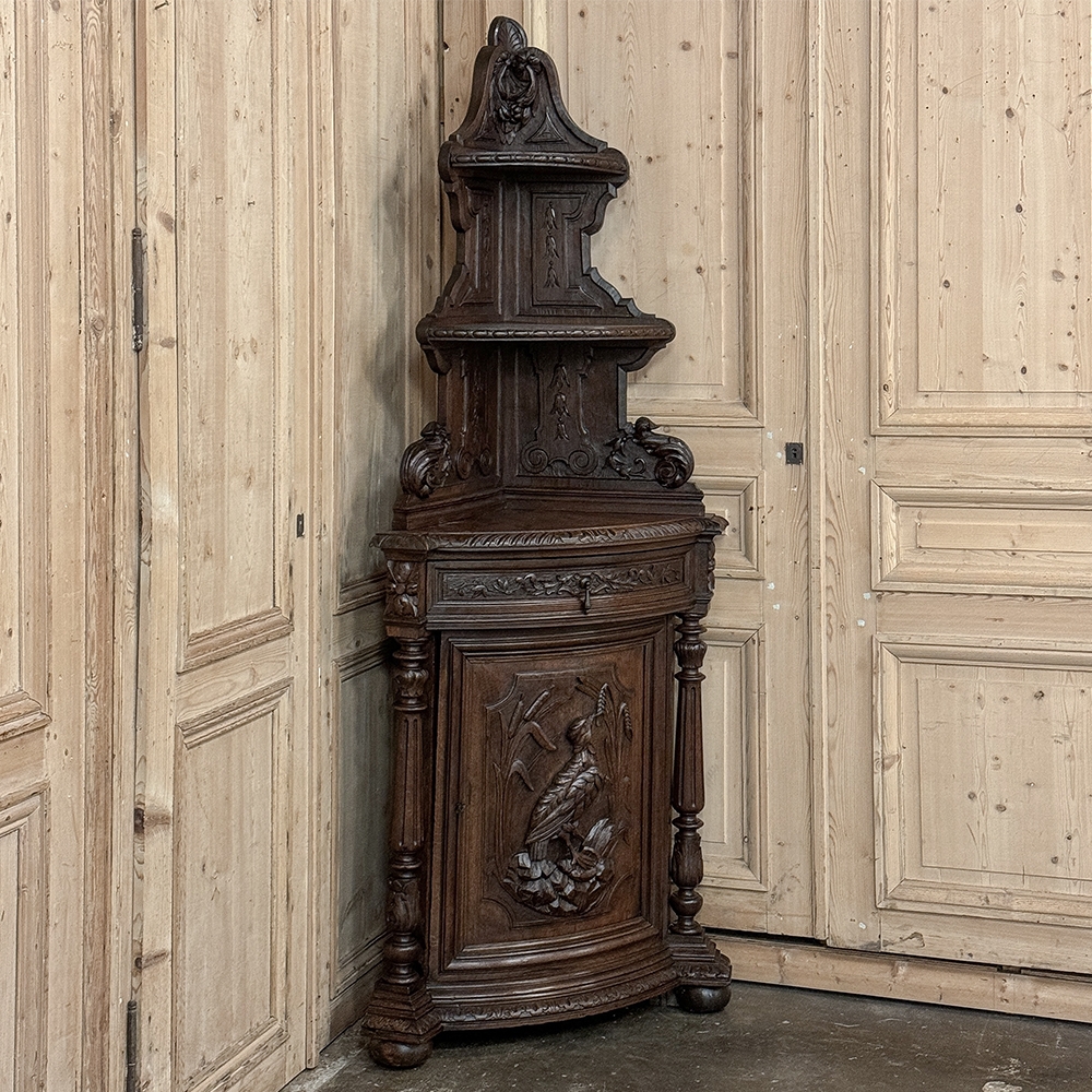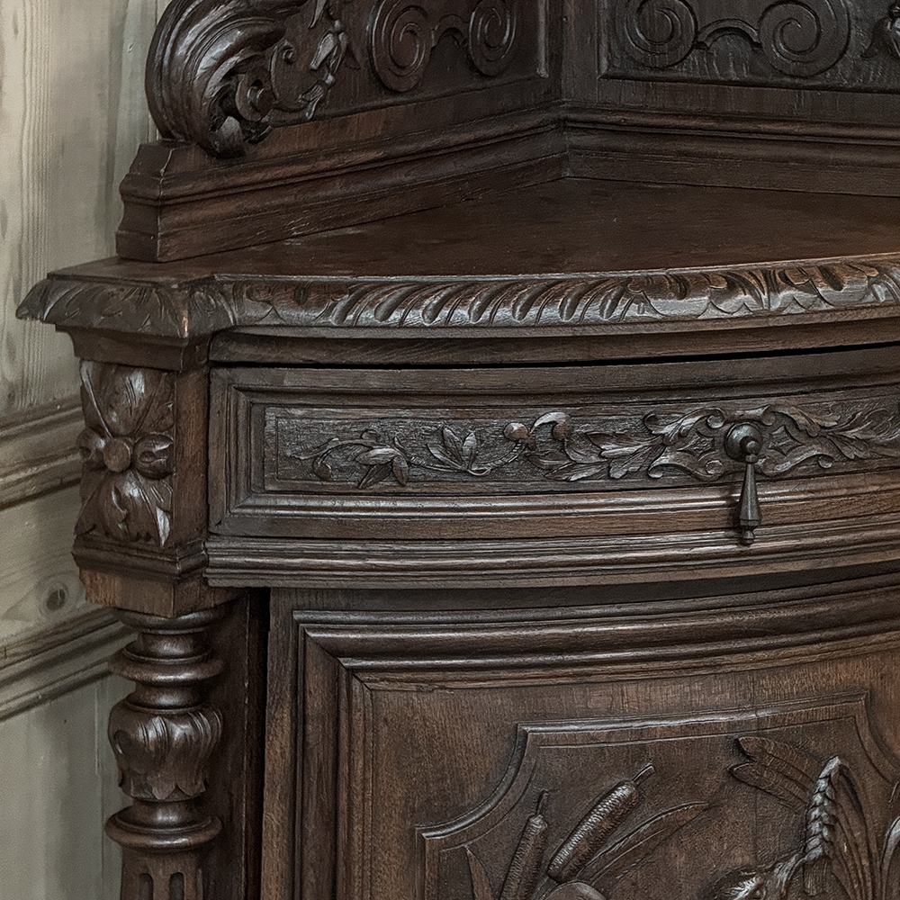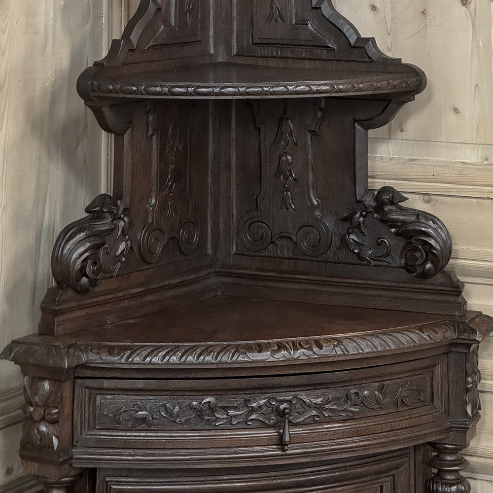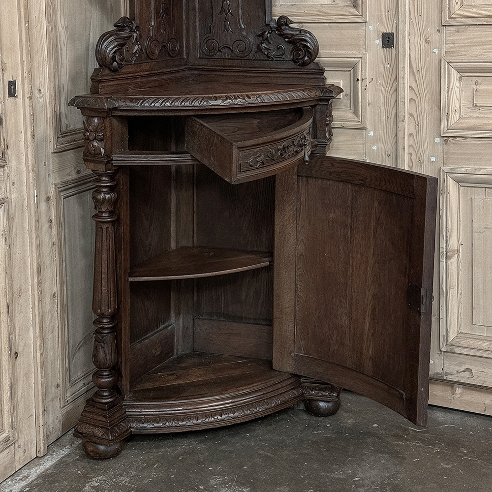 19th Century French Renaissance Revival Corner Cabinet represents a glorification of nature and the beauty all around us which at the time was fervently attributed to our creator. This example tucks into a corner, an otherwise unused portion of the room, creating not only a visual feast but a convenient place to store and display a few family heirlooms for all to appreciate! Hand-crafted and carved from select old-growth oak, it features an arched crown with foliates overlooking three surfaces, each with gadrooned edges and supported by exquisitely carved side panels. The cabinet consists of a pie-shaped drawer that rotates out when needed, just like the curved door panel below festooned with a full relief depiction of a bird in the wild feasting on wild oats. The drawer is festooned with bas relief and fitted with a pendant pull, and flanked by rosettes that appear over two full column supports that are tapered, fluted and carved to adequately frame the sculptural work of the door. Multiple tiers of molding abound throughout the design, especially at the base which is fitted with bun feet.
