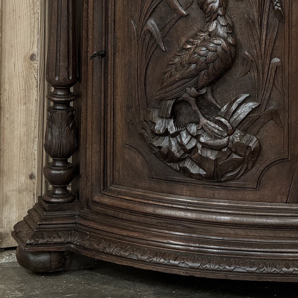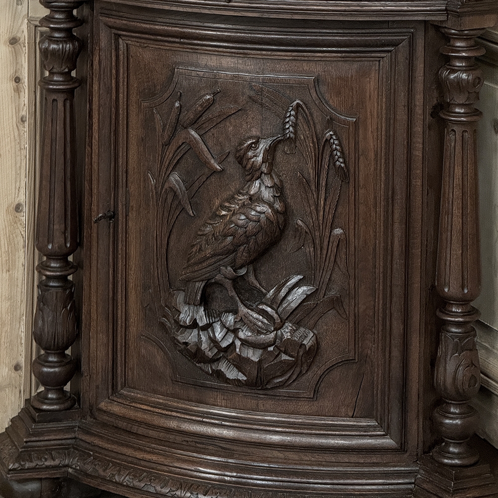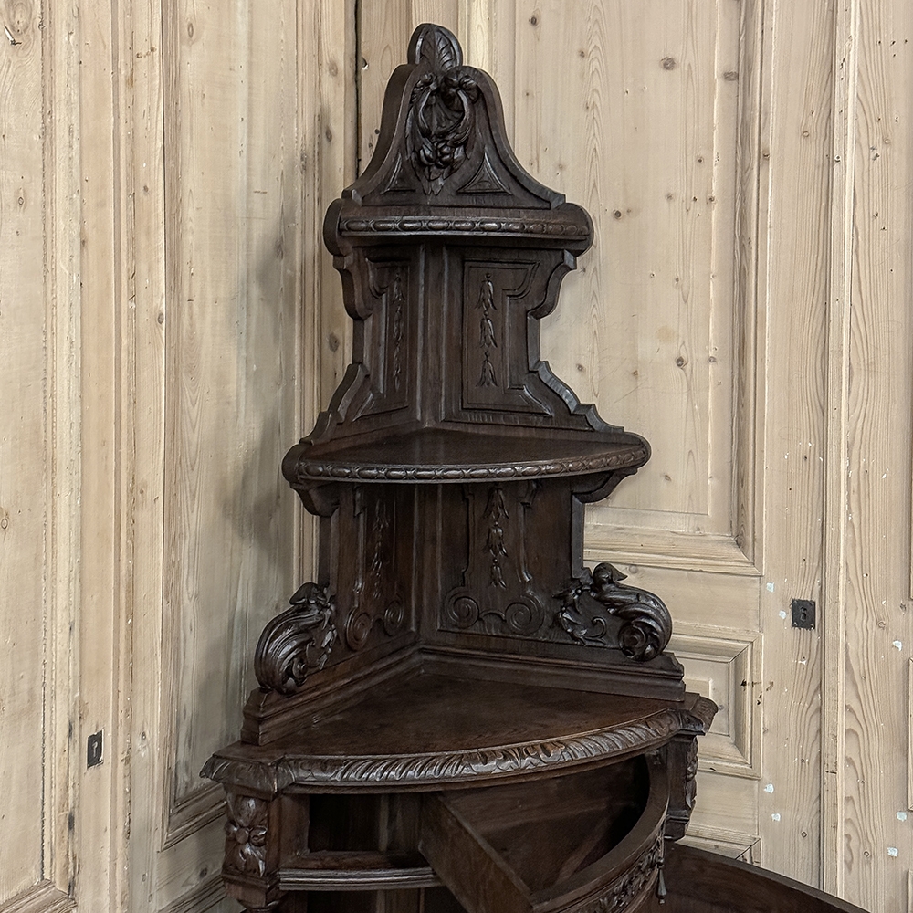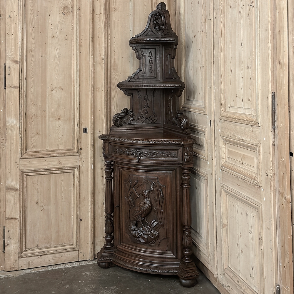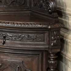 19th Century French Renaissance Revival Corner Cabinet represents a glorification of nature and the beauty all around us which at the time was fervently attributed to our creator. This example tucks into a corner, an otherwise unused portion of the room, creating not only a visual feast but a convenient place to store and display a few family heirlooms for all to appreciate! Hand-crafted and carved from select old-growth oak, it features an arched crown with foliates overlooking three surfaces, each with gadrooned edges and supported by exquisitely carved side panels. The cabinet consists of a pie-shaped drawer that rotates out when needed, just like the curved door panel below festooned with a full relief depiction of a bird in the wild feasting on wild oats. The drawer is festooned with bas relief and fitted with a pendant pull, and flanked by rosettes that appear over two full column supports that are tapered, fluted and carved to adequately frame the sculptural work of the door. Multiple tiers of molding abound throughout the design, especially at the base which is fitted with bun feet.