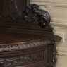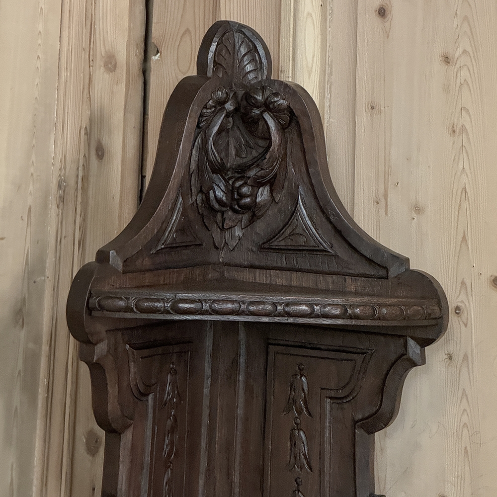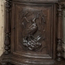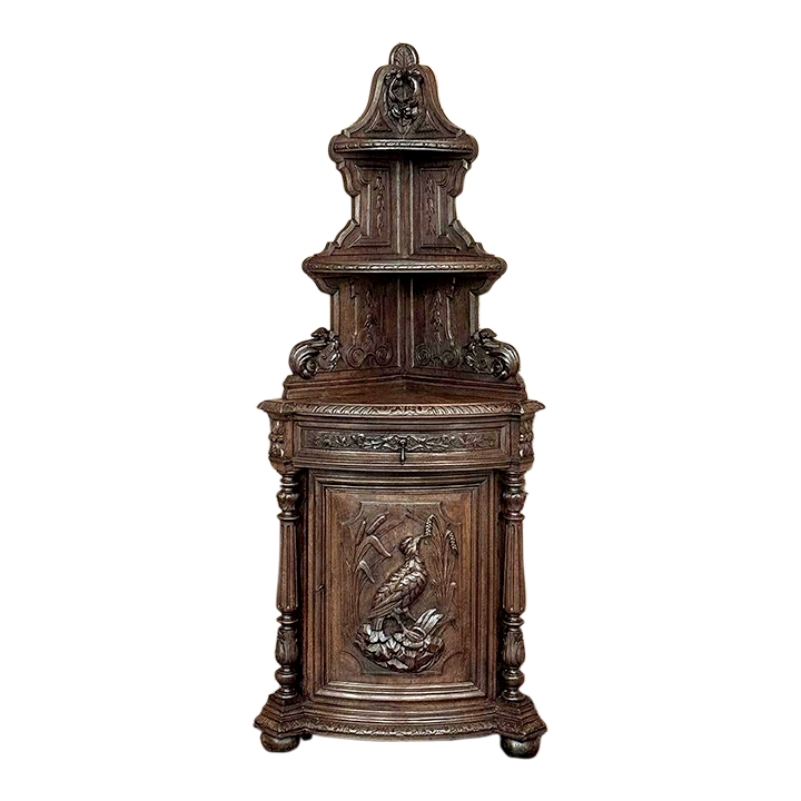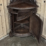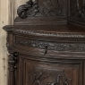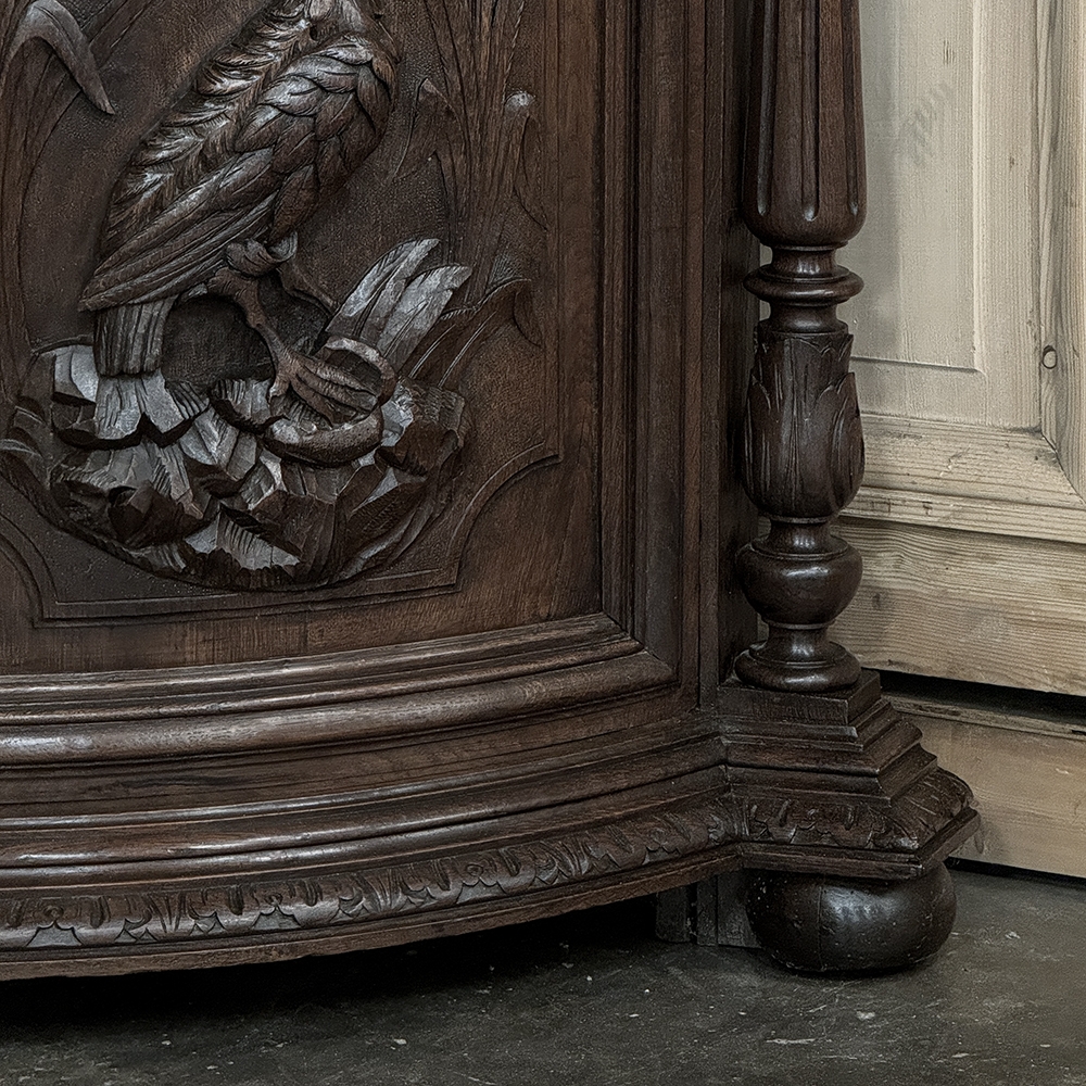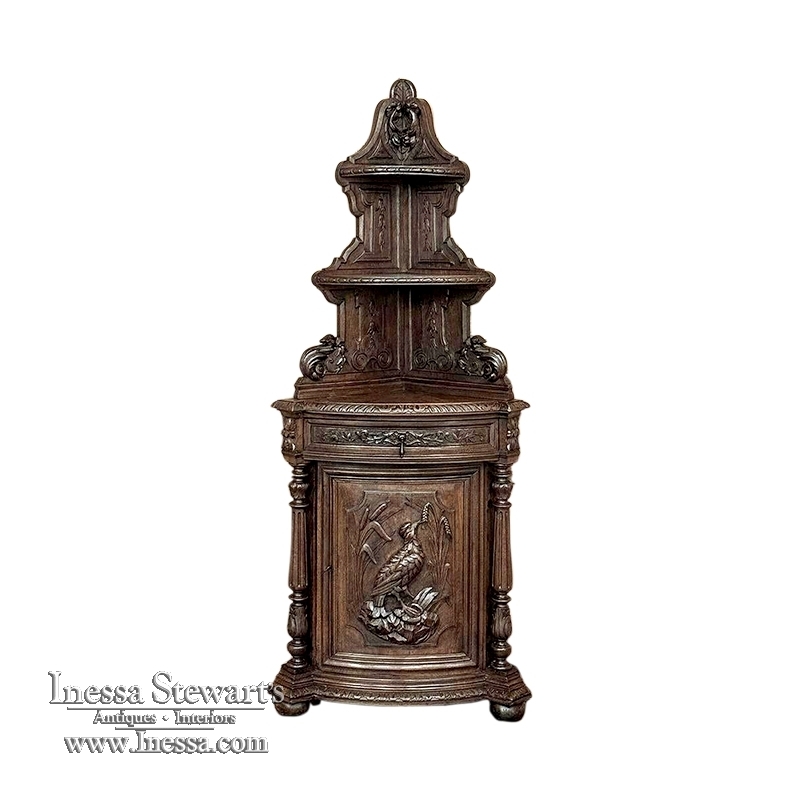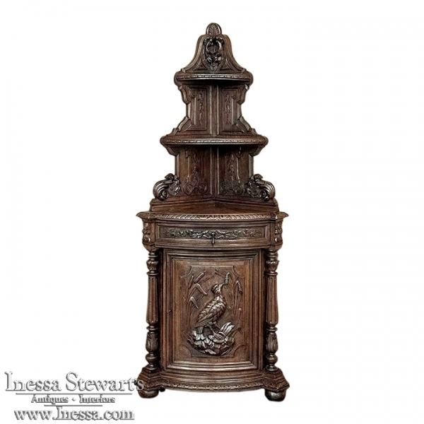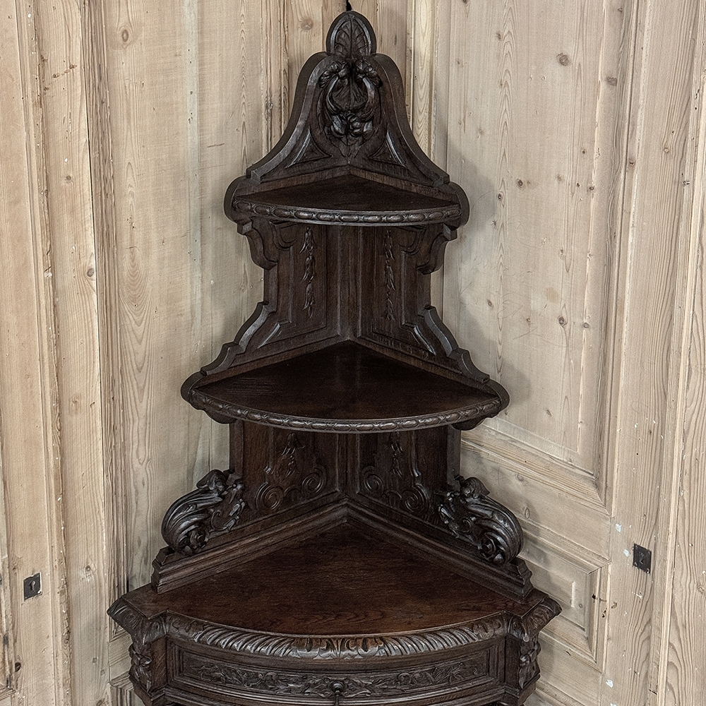 19th Century French Renaissance Revival Corner Cabinet represents a glorification of nature and the beauty all around us which at the time was fervently attributed to our creator. This example tucks into a corner, an otherwise unused portion of the room, creating not only a visual feast but a convenient place to store and display a few family heirlooms for all to appreciate! Hand-crafted and carved from select old-growth oak, it features an arched crown with foliates overlooking three surfaces, each with gadrooned edges and supported by exquisitely carved side panels. The cabinet consists of a pie-shaped drawer that rotates out when needed, just like the curved door panel below festooned with a full relief depiction of a bird in the wild feasting on wild oats. The drawer is festooned with bas relief and fitted with a pendant pull, and flanked by rosettes that appear over two full column supports that are tapered, fluted and carved to adequately frame the sculptural work of the door. Multiple tiers of molding abound throughout the design, especially at the base which is fitted with bun feet.