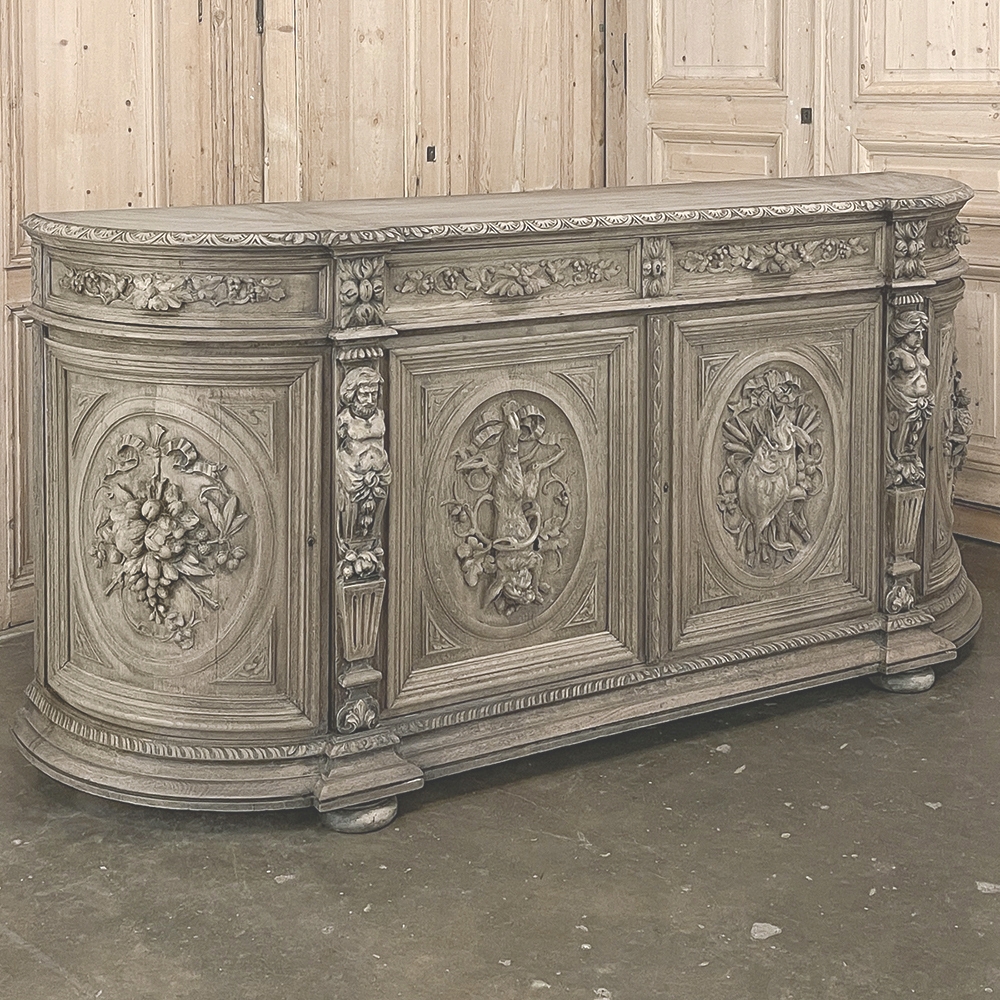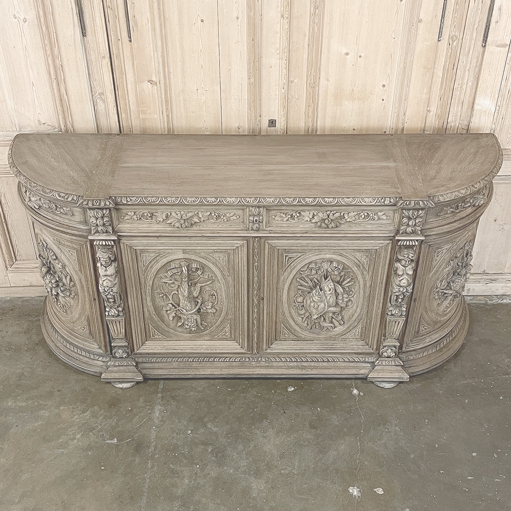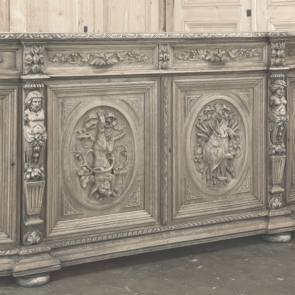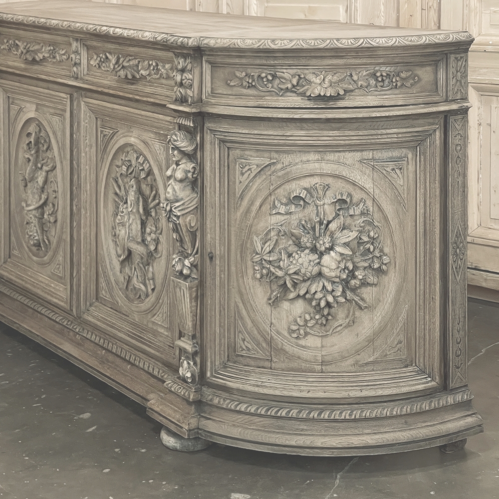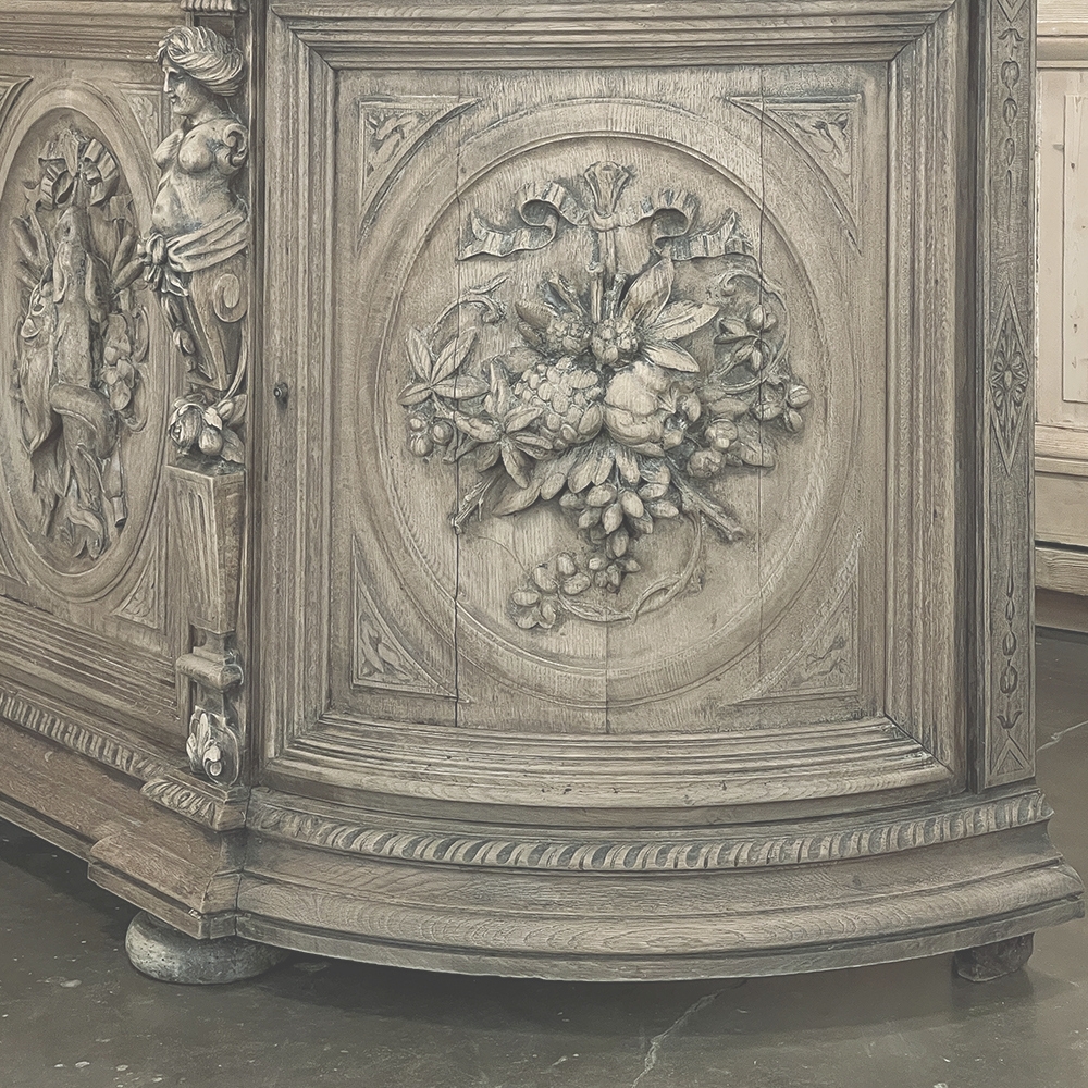 19th Century French Renaissance Revival Hunt Buffet represents a spectacular example of the glorious revival of the Renaissance that occurred during the middle of the century all across Europe, inspired by the monarchy of Napoleon III. This example is particularly stunning, celebrating the spoils of the hunt as well as the many blessings we are fortunate to enjoy, rendered by a master wood sculptor in vivid full relief. Although the tape measure records just under two feet in maximum depth, that occurs only on the base molding trim of the projecting pilasters in front, and with the generously rounded sides, the piece is much more traffic-friendly that the raw specifications would indicate. A full seven feet in width, it has been carved across the entire facade, starting with a meticulously gadrooned edge with a repeating demilune fletching pattern, all rendered by hand just like all the rest of the carvings. Just below, four drawers have been provided, with the two central doors being of regular configuration, and the left and right drawers following the roundness of the sides, and fitted with pivoting hinges. Each of the four drawers are lavished with beautiful fully laden grapevines with leaves at the center projecting out to serve as the drawer pull. All four drawers are flanked by vertical rosettes for definition. Under the two most prominent rosettes are caryatid style pilasters with a male and female figure atop architectural devices adorned with flowers, all resting on pediments below that blend with the bold base molding. The cabinet doors, however, are literal works of art in their own right, even considered individually. Although the rounded right and left cabinet door panels both depict incredible abundances of fruit staged as if hung by flowing ribbon in an oval framework, each panel is a different composition. The uniqueness of the two center door panels is immediately apparent even though both glorify the hunt, with the left side a hare amongst oak leaves and acorns, and the right fish set upon a background of plants found near the waterside. Each of the four oval sculptures are beautifully framed by the cabinet door moldings, of course. The doors all open wide to reveal capacious storage, and the top surface is generous enough to serve a wide variety of daily needs. Painstakingly stripped to retain the patina achieved over a century and a half, while revealing the natural beauty of the old-growth oak to create a soft visual effect that is incredibly captivating!