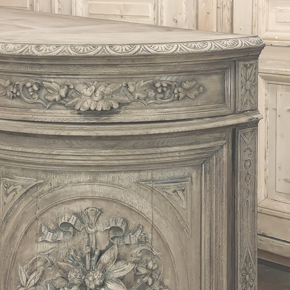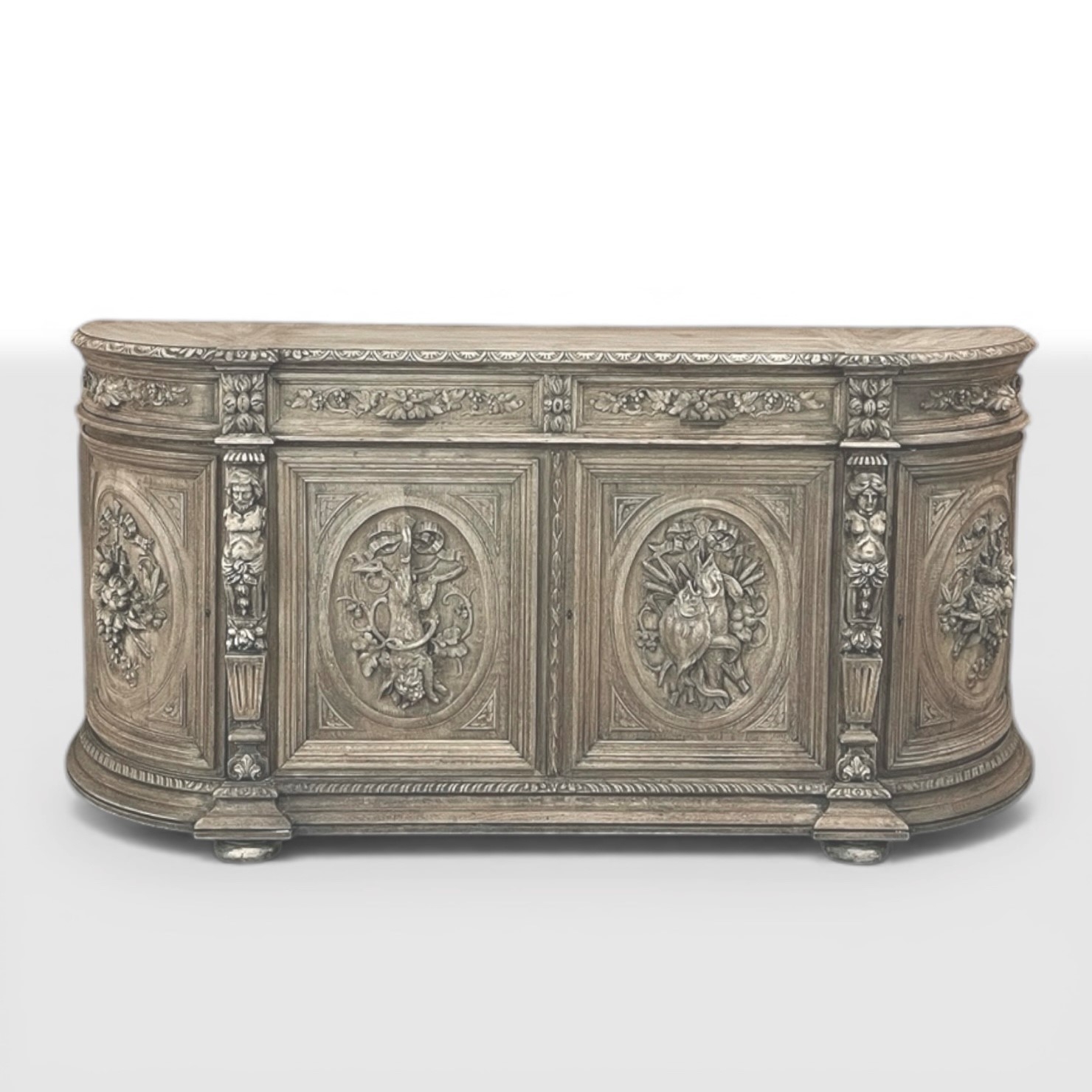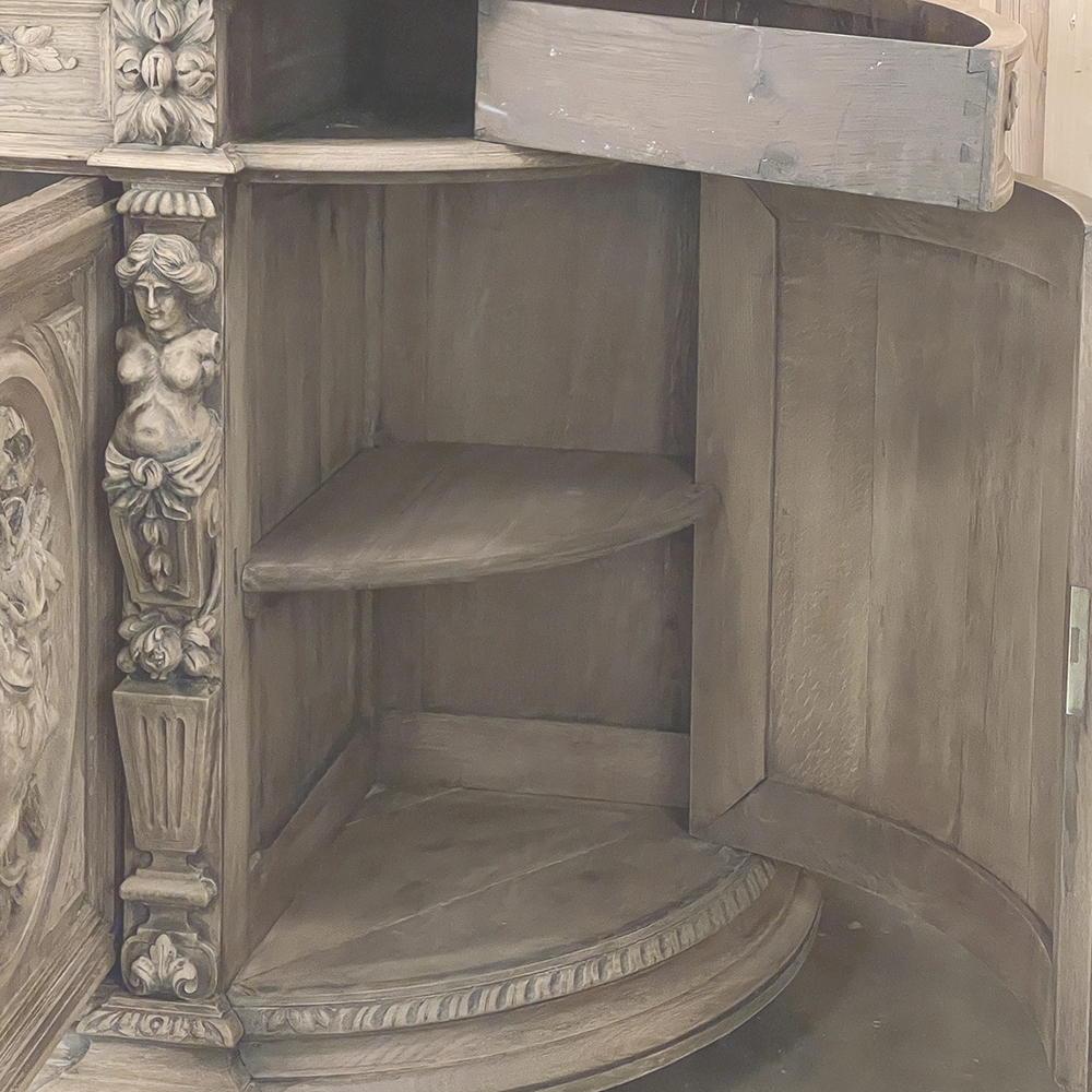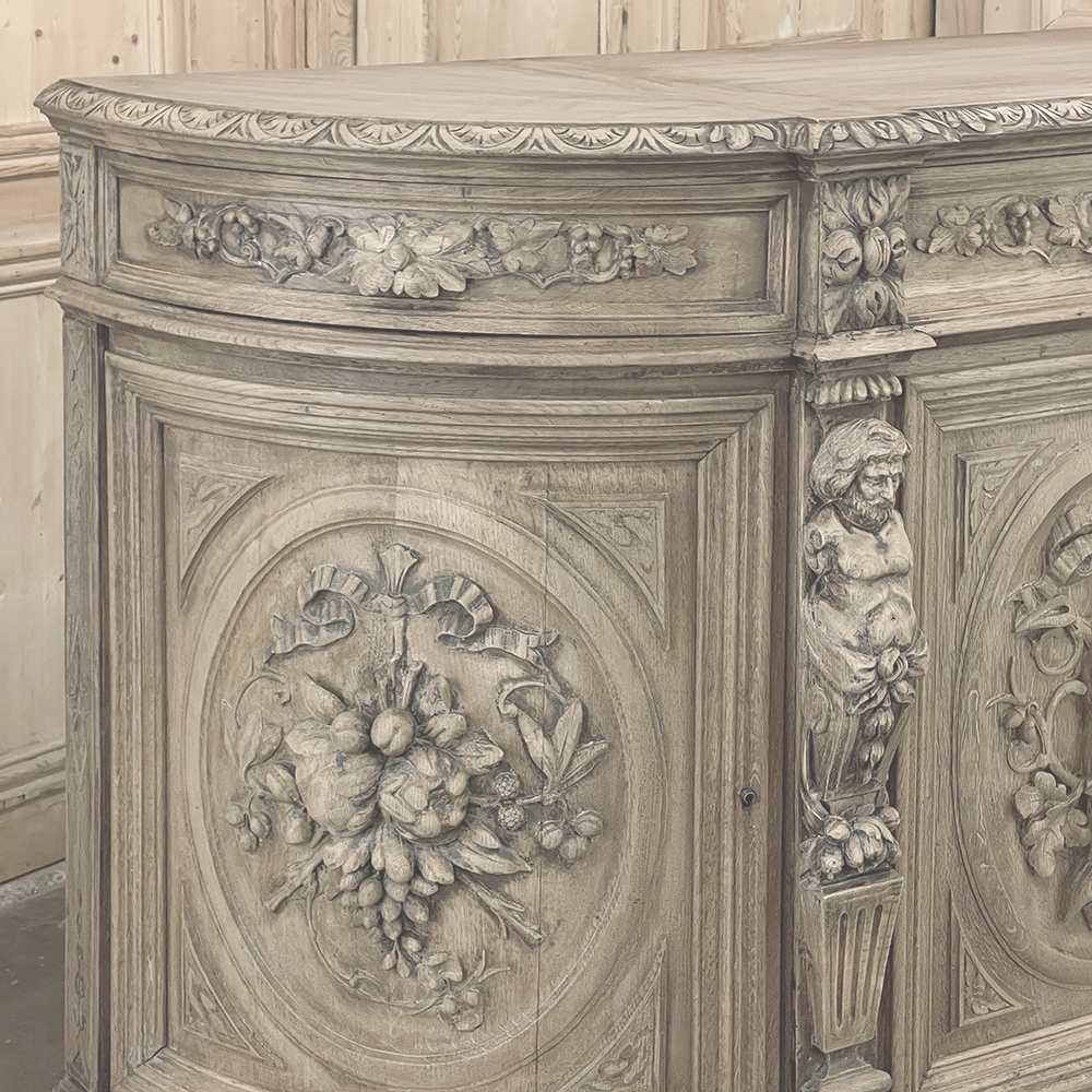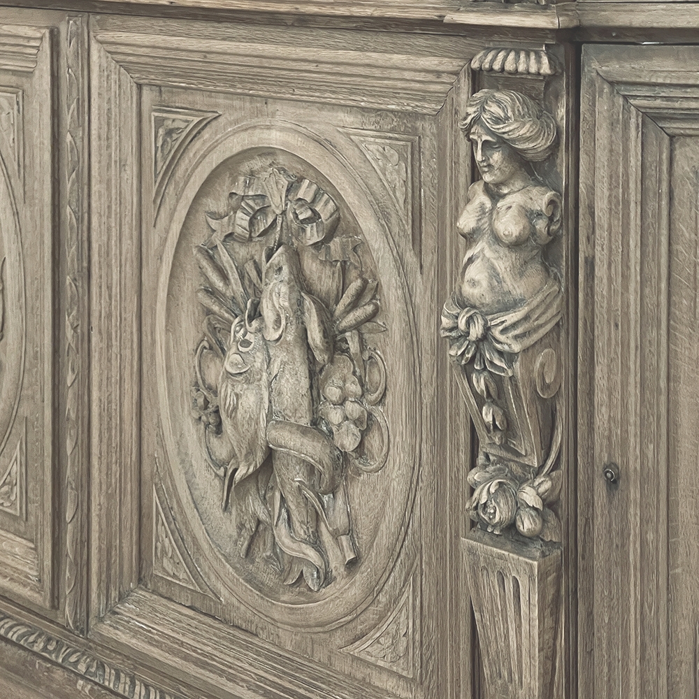 19th Century French Renaissance Revival Hunt Buffet represents a spectacular example of the glorious revival of the Renaissance that occurred during the middle of the century all across Europe, inspired by the monarchy of Napoleon III. This example is particularly stunning, celebrating the spoils of the hunt as well as the many blessings we are fortunate to enjoy, rendered by a master wood sculptor in vivid full relief. Although the tape measure records just under two feet in maximum depth, that occurs only on the base molding trim of the projecting pilasters in front, and with the generously rounded sides, the piece is much more traffic-friendly that the raw specifications would indicate. A full seven feet in width, it has been carved across the entire facade, starting with a meticulously gadrooned edge with a repeating demilune fletching pattern, all rendered by hand just like all the rest of the carvings. Just below, four drawers have been provided, with the two central doors being of regular configuration, and the left and right drawers following the roundness of the sides, and fitted with pivoting hinges. Each of the four drawers are lavished with beautiful fully laden grapevines with leaves at the center projecting out to serve as the drawer pull. All four drawers are flanked by vertical rosettes for definition. Under the two most prominent rosettes are caryatid style pilasters with a male and female figure atop architectural devices adorned with flowers, all resting on pediments below that blend with the bold base molding. The cabinet doors, however, are literal works of art in their own right, even considered individually. Although the rounded right and left cabinet door panels both depict incredible abundances of fruit staged as if hung by flowing ribbon in an oval framework, each panel is a different composition. The uniqueness of the two center door panels is immediately apparent even though both glorify the hunt, with the left side a hare amongst oak leaves and acorns, and the right fish set upon a background of plants found near the waterside. Each of the four oval sculptures are beautifully framed by the cabinet door moldings, of course. The doors all open wide to reveal capacious storage, and the top surface is generous enough to serve a wide variety of daily needs. Painstakingly stripped to retain the patina achieved over a century and a half, while revealing the natural beauty of the old-growth oak to create a soft visual effect that is incredibly captivating!