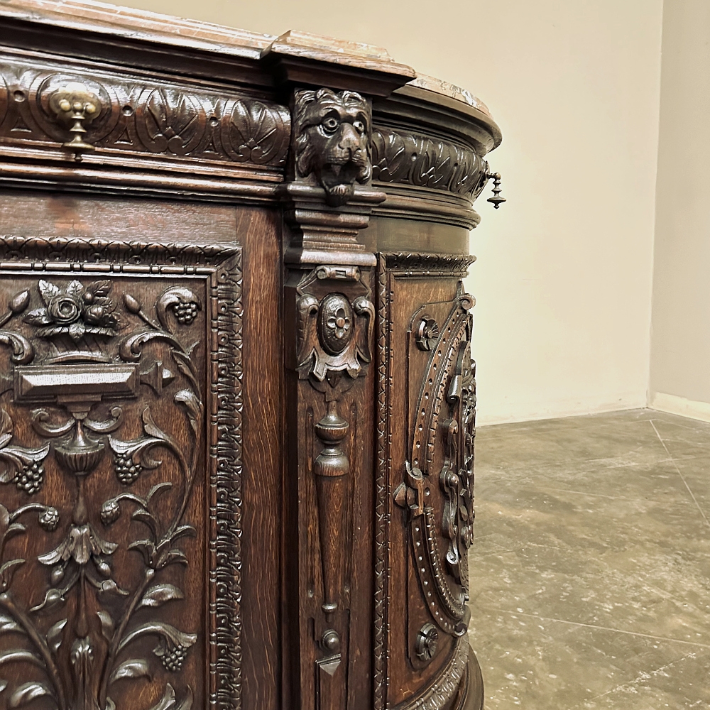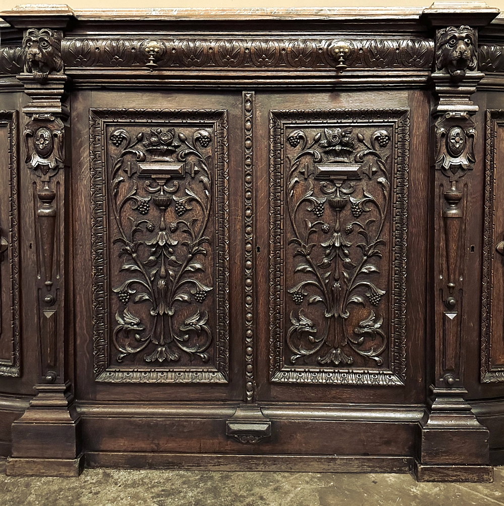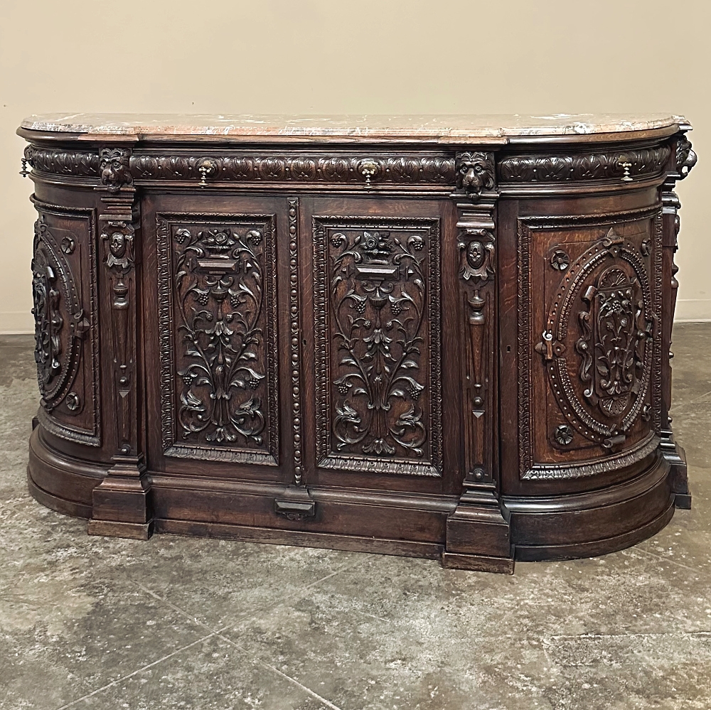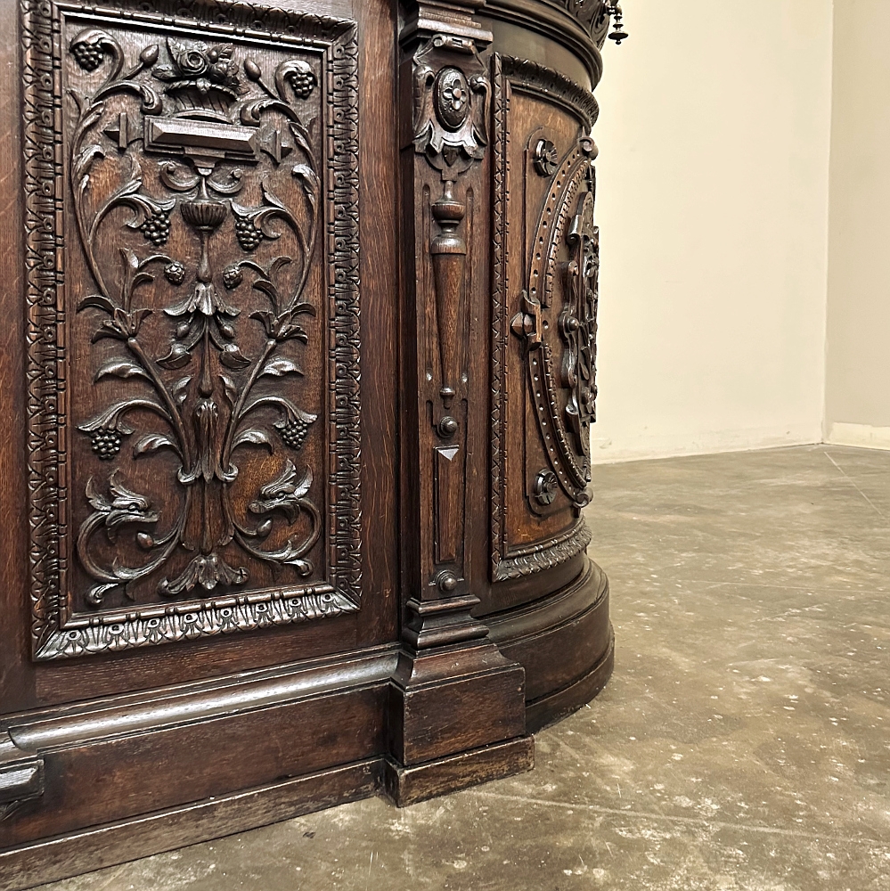 SaleOriginally created for a Normandy château, this remarkable 19th century French buffet is a richly sculpted statement in the Renaissance Revival style, with all the presence, artistry, and decorative power that make Henri II furniture so compelling today. Its rounded sides are not only visually striking, but also speak to the caliber of the piece. Favored in fine Renaissance Revival furniture for the better flow they brought to a room, such contours required exceptional craftsmanship, as the oak had to be carved on a radius with great precision, demanding both skill and expense to achieve.