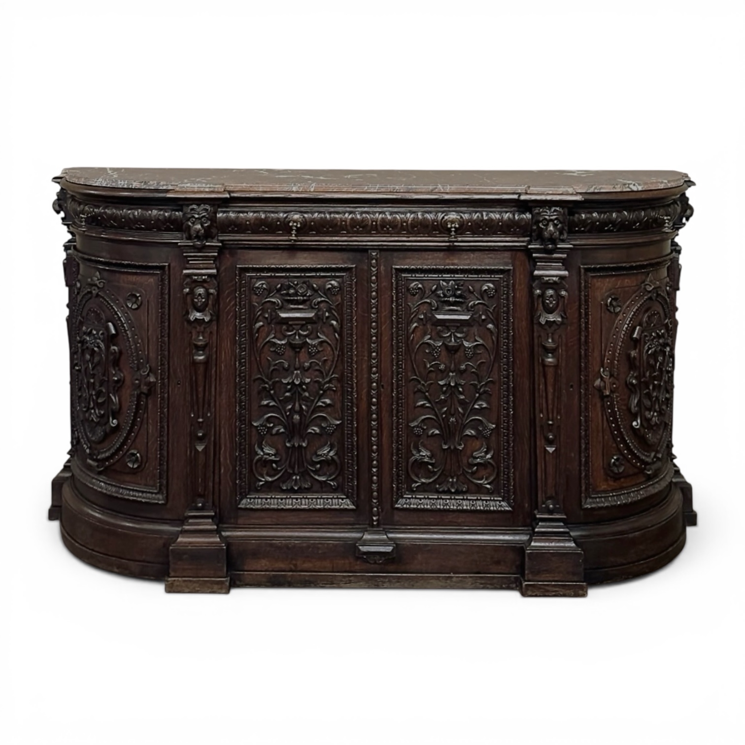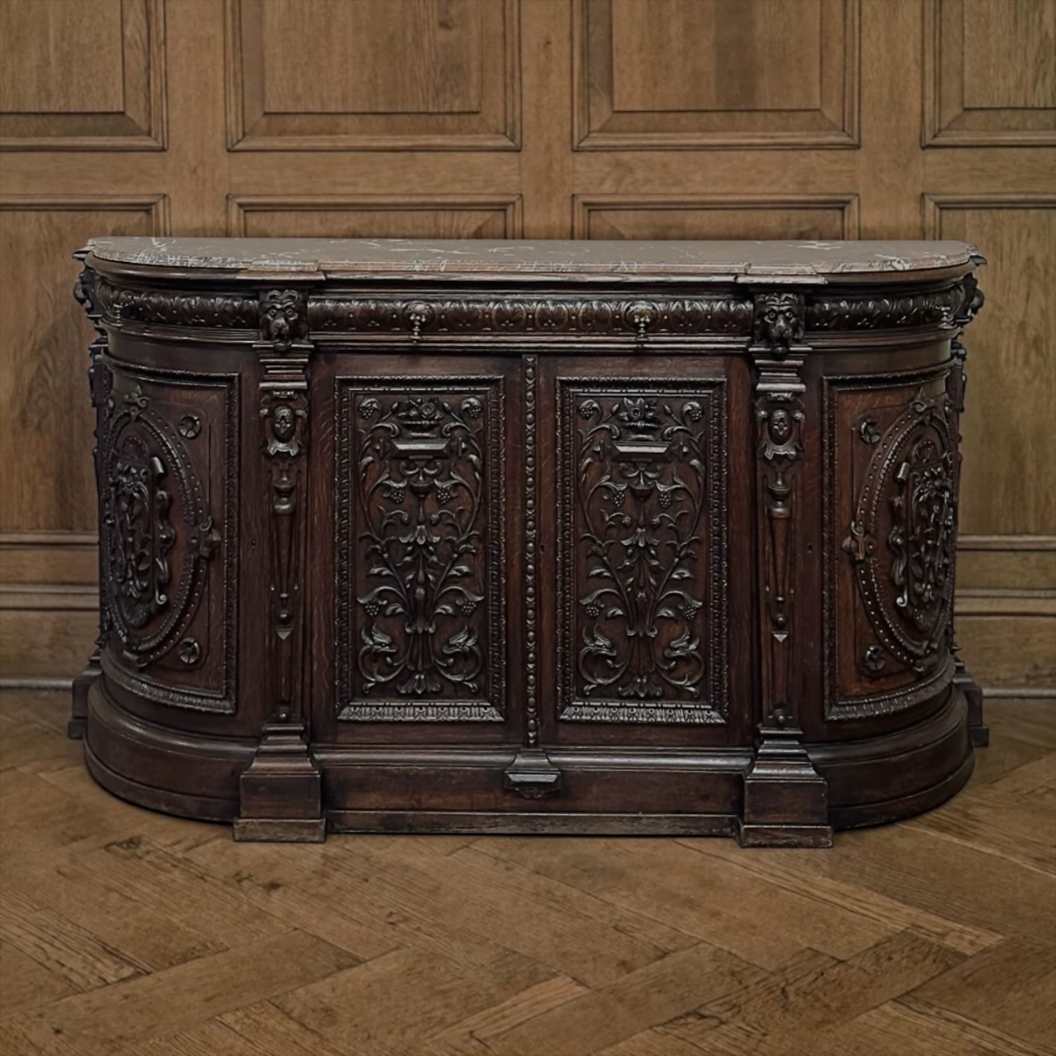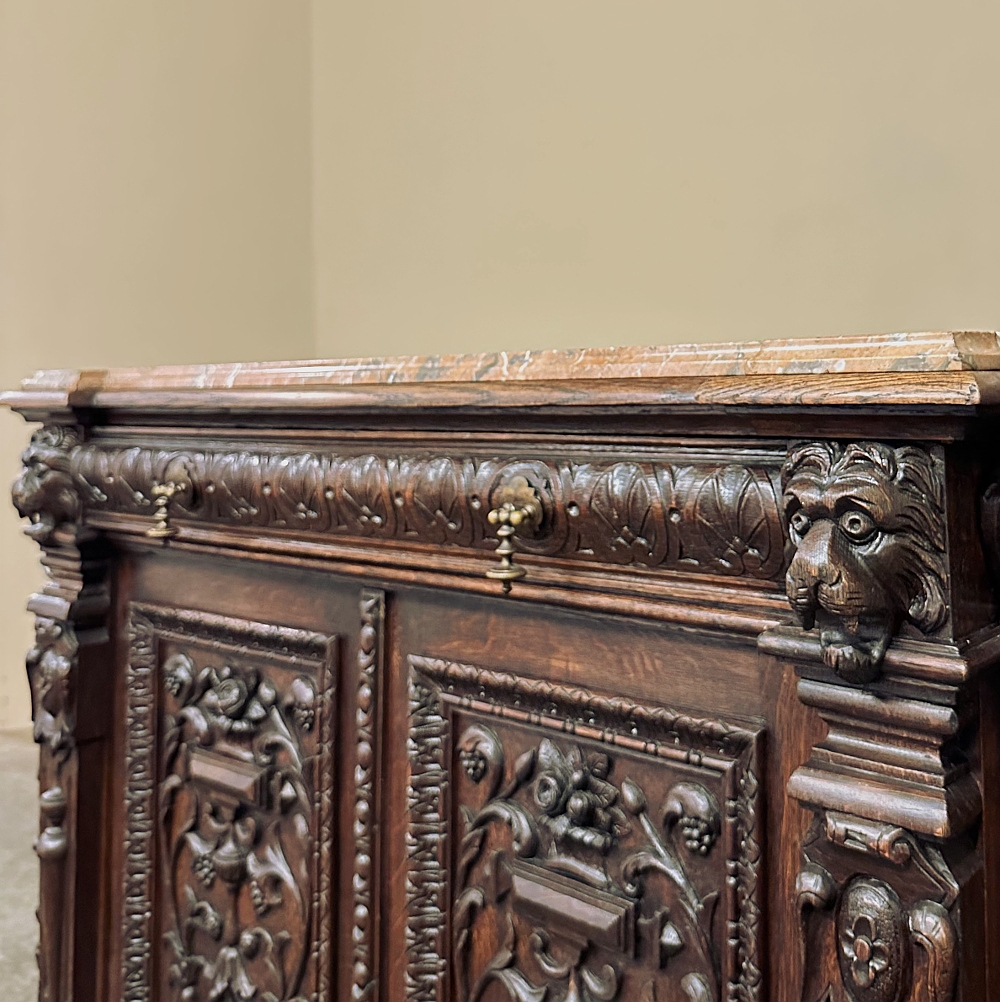 The original marble top, beautifully veined and shaped to follow the contours of the case, adds another layer of distinction while providing an elegant surface for serving, display, or entertaining. Below, the façade is animated by bold lion’s heads, heraldic motifs, foliate relief, and carved pilasters, all executed in richly patinated oak with impressive depth and movement. Every surface reflects the kind of workmanship and design confidence reserved for better furniture of the period, while the generous drawers and cabinets provide abundant storage behind all that beauty.