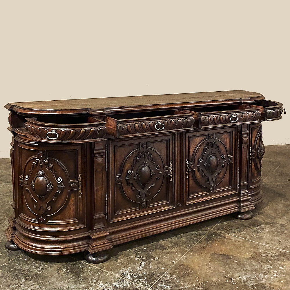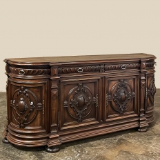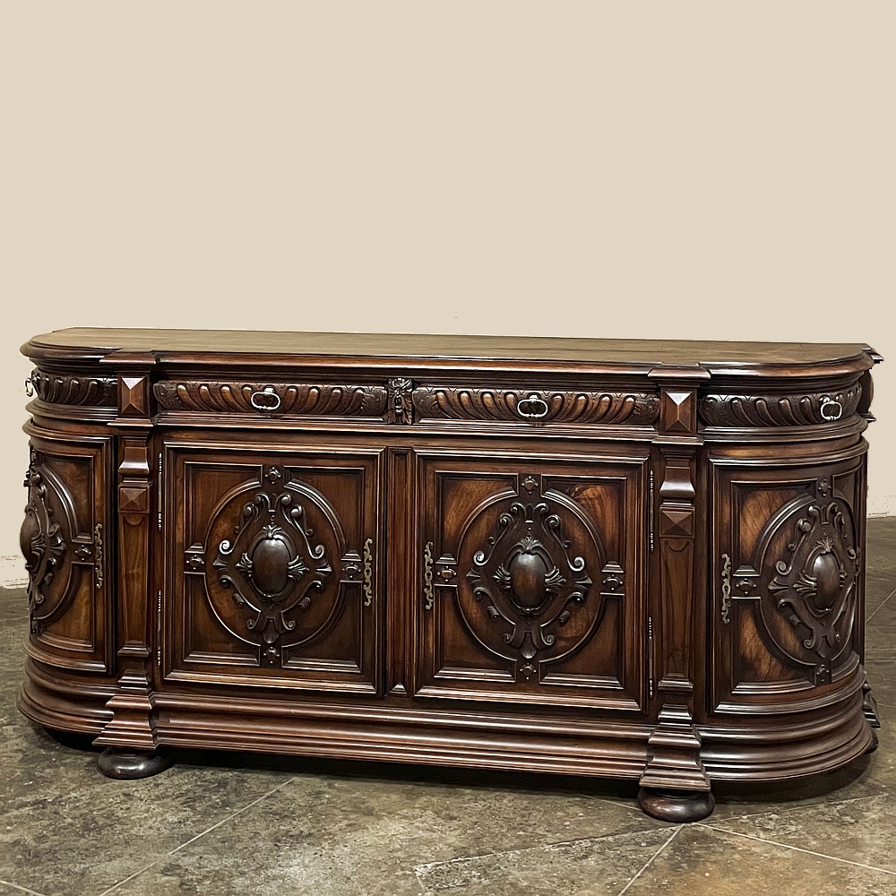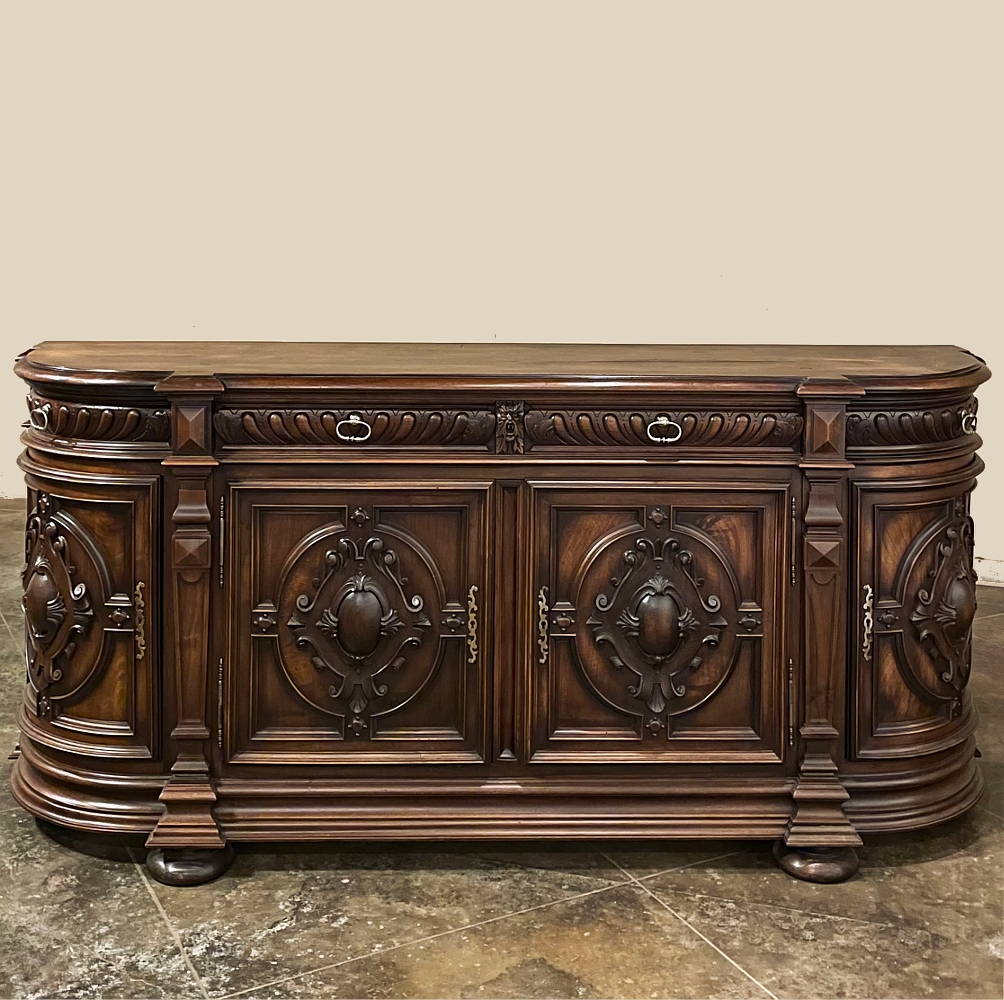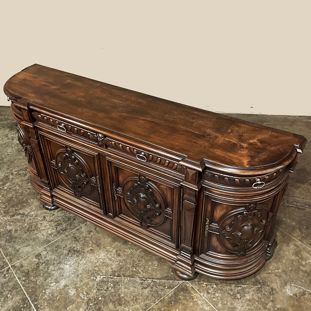 19th Century French Renaissance Revival Walnut Buffet is a masterpiece of the artisans around the environs of Paris who strove to follow the trends set by the court, in this instance Napoleon III. Here we see the stylized, Italianate expression of the High Renaissance, executed in sumptuous French walnut and in the process creating a truly superlative example of the furniture maker's art! Even though the piece is almost eight feet in width, its generously rounded sides soften the impact on the traffic pattern of the room, resulting in the effect of a smaller piece. The beveled top in solid walnut planks follows the complex contour of the casework below, as does the bold multi-tiered base molding below. Just under the top is a tier of four drawers, each heavily gadrooned and framed with pyramidal plinth blocks that also are situated above the twin pilasters that frame the main cabinet doors below. Each cabinet door, including the two rounded side doors, is resplendent with bold heraldic crests centered with an egg form, and set in oval molded frameworks, all in the Italian style. Each door is also hung with outboard brass hinges with finials and brass key guards for a nice visual touch. Large bun feet provide support.