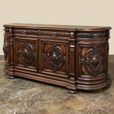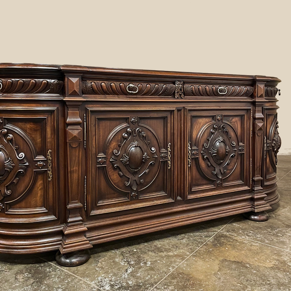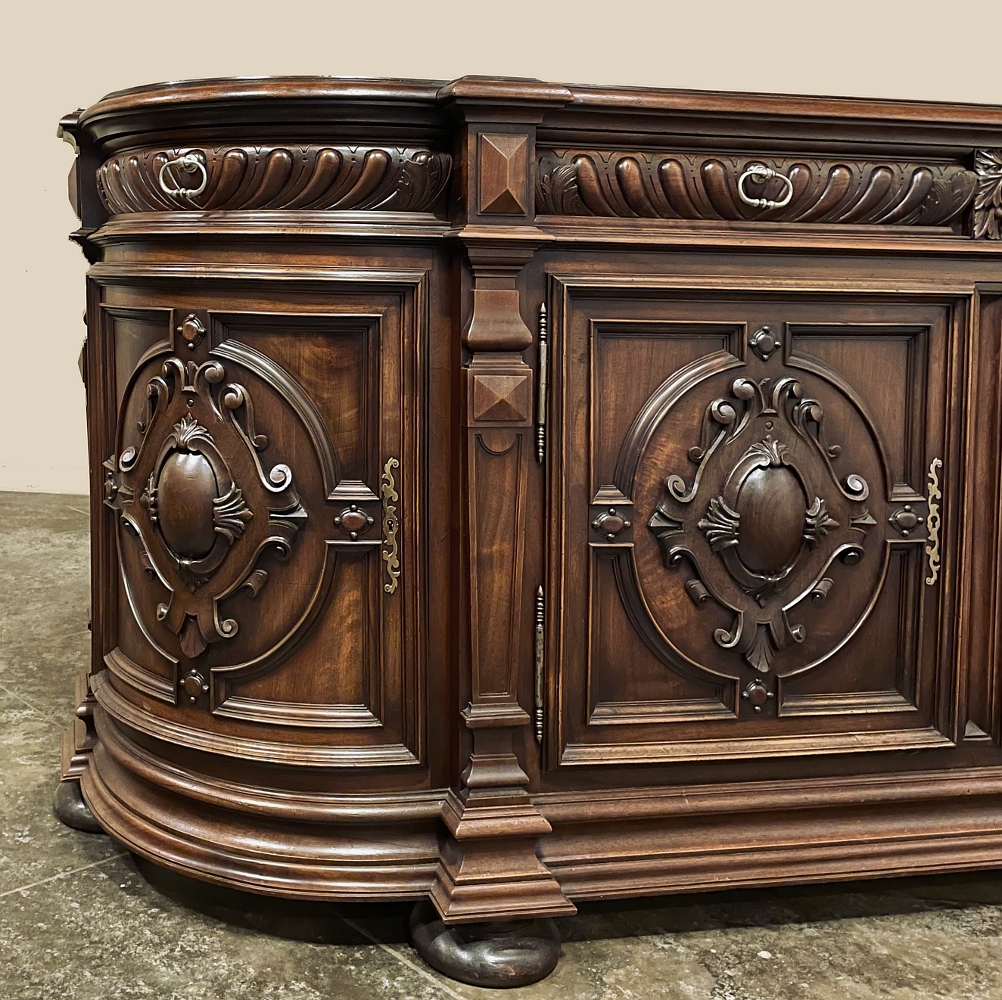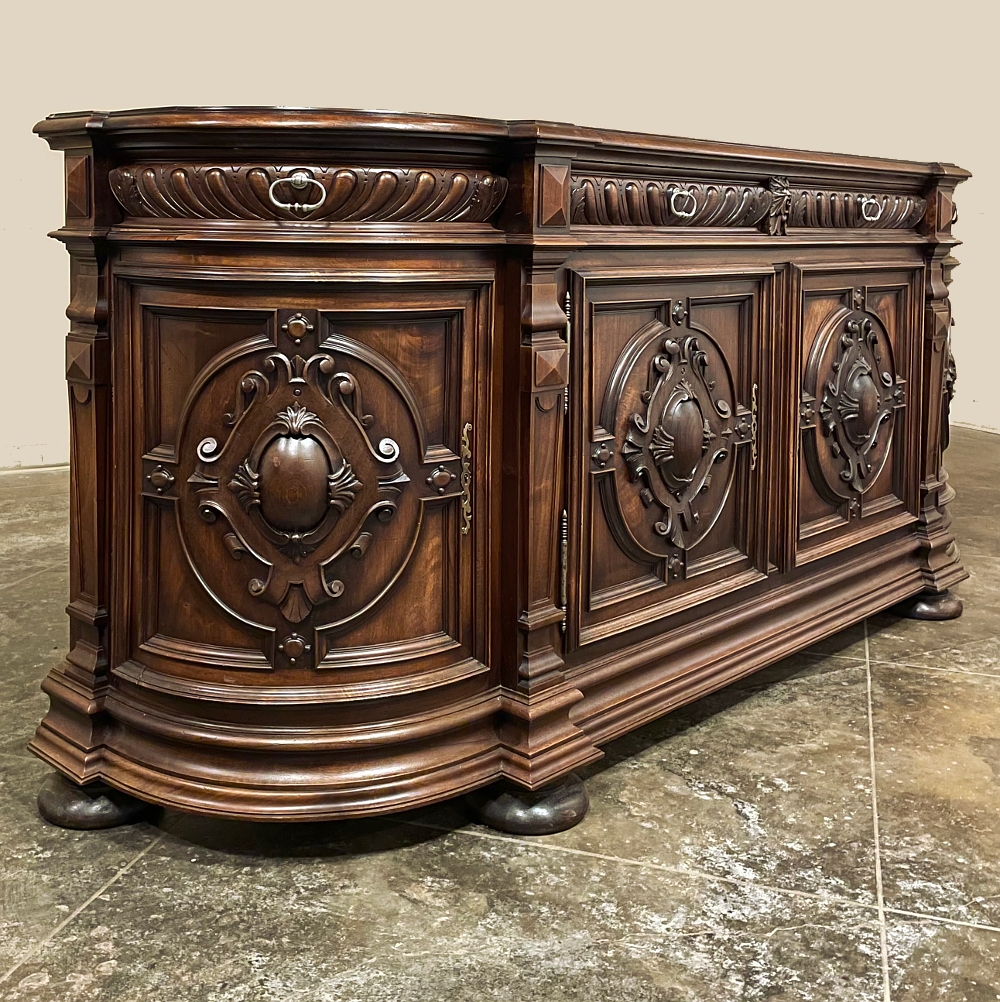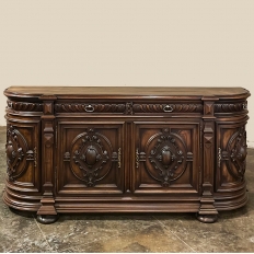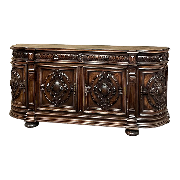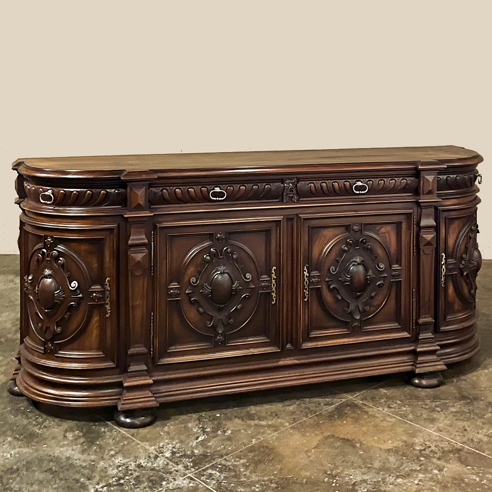 19th Century French Renaissance Revival Walnut Buffet is a masterpiece of the artisans around the environs of Paris who strove to follow the trends set by the court, in this instance Napoleon III. Here we see the stylized, Italianate expression of the High Renaissance, executed in sumptuous French walnut and in the process creating a truly superlative example of the furniture maker's art! Even though the piece is almost eight feet in width, its generously rounded sides soften the impact on the traffic pattern of the room, resulting in the effect of a smaller piece. The beveled top in solid walnut planks follows the complex contour of the casework below, as does the bold multi-tiered base molding below. Just under the top is a tier of four drawers, each heavily gadrooned and framed with pyramidal plinth blocks that also are situated above the twin pilasters that frame the main cabinet doors below. Each cabinet door, including the two rounded side doors, is resplendent with bold heraldic crests centered with an egg form, and set in oval molded frameworks, all in the Italian style. Each door is also hung with outboard brass hinges with finials and brass key guards for a nice visual touch. Large bun feet provide support.