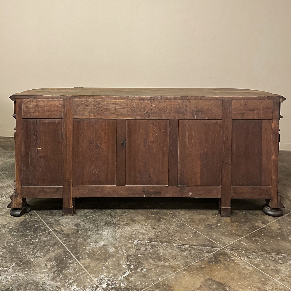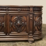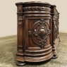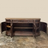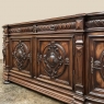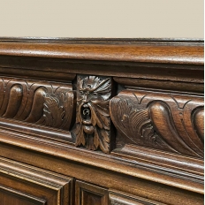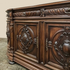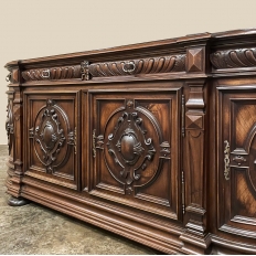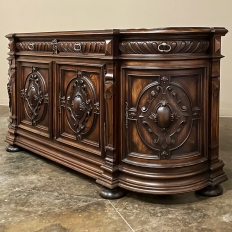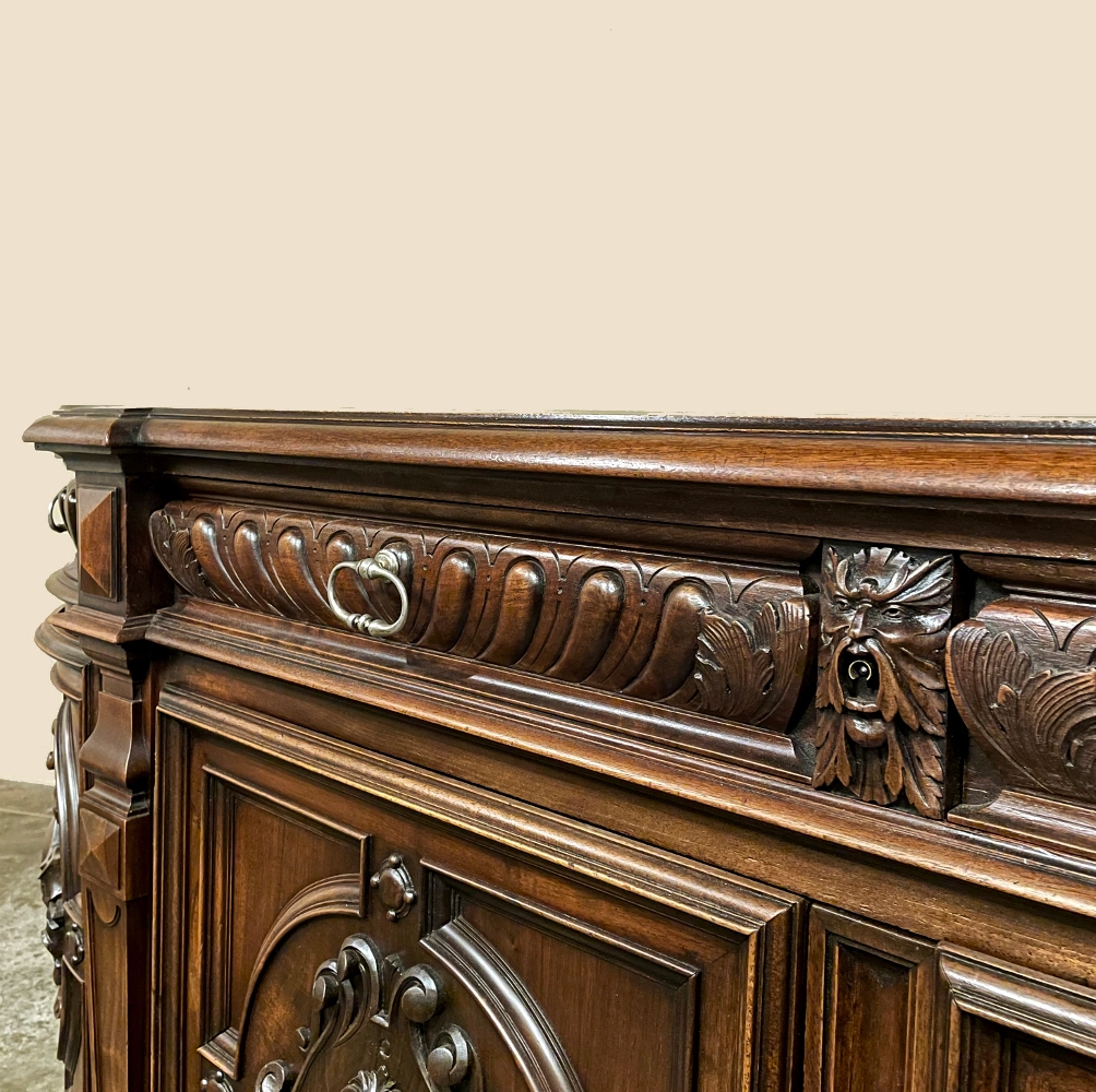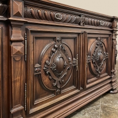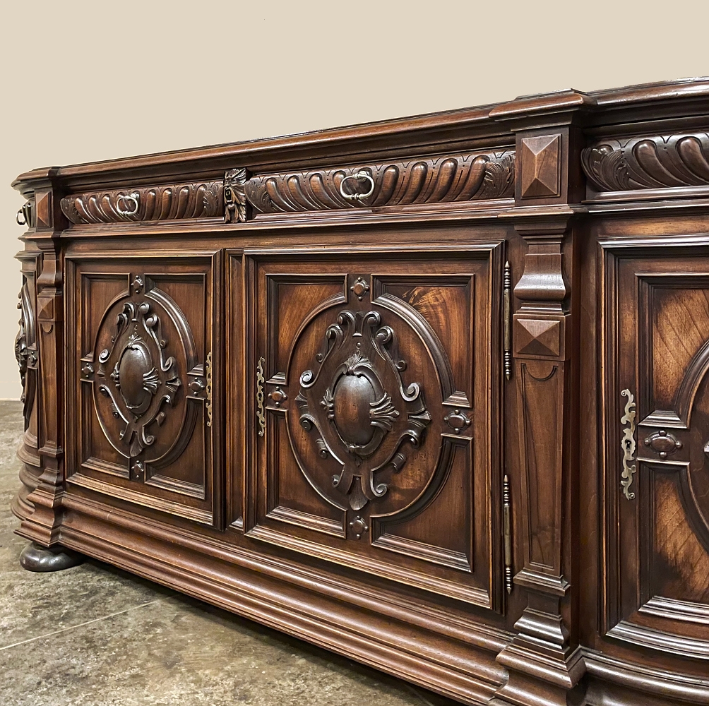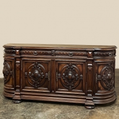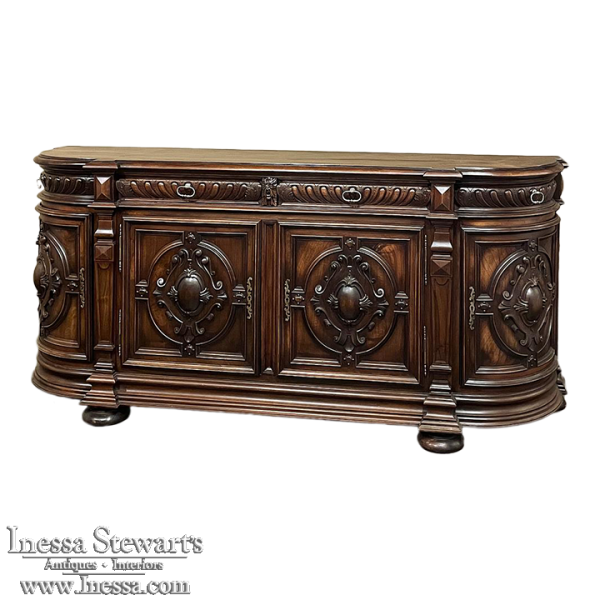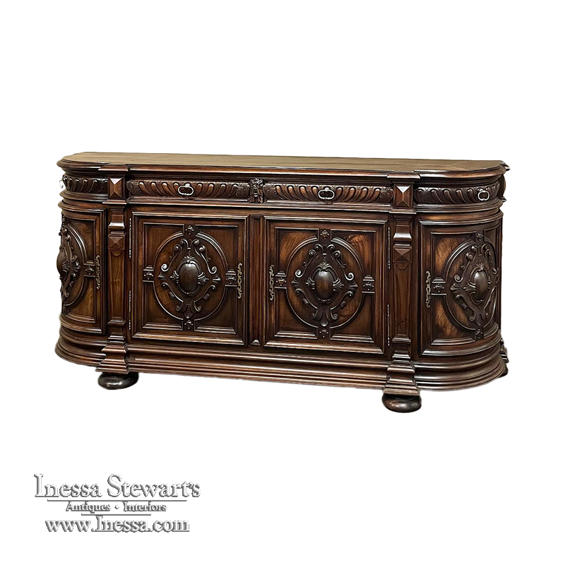 19th Century French Renaissance Revival Walnut Buffet is a masterpiece of the artisans around the environs of Paris who strove to follow the trends set by the court, in this instance Napoleon III. Here we see the stylized, Italianate expression of the High Renaissance, executed in sumptuous French walnut and in the process creating a truly superlative example of the furniture maker's art! Even though the piece is almost eight feet in width, its generously rounded sides soften the impact on the traffic pattern of the room, resulting in the effect of a smaller piece. The beveled top in solid walnut planks follows the complex contour of the casework below, as does the bold multi-tiered base molding below. Just under the top is a tier of four drawers, each heavily gadrooned and framed with pyramidal plinth blocks that also are situated above the twin pilasters that frame the main cabinet doors below. Each cabinet door, including the two rounded side doors, is resplendent with bold heraldic crests centered with an egg form, and set in oval molded frameworks, all in the Italian style. Each door is also hung with outboard brass hinges with finials and brass key guards for a nice visual touch. Large bun feet provide support.