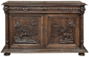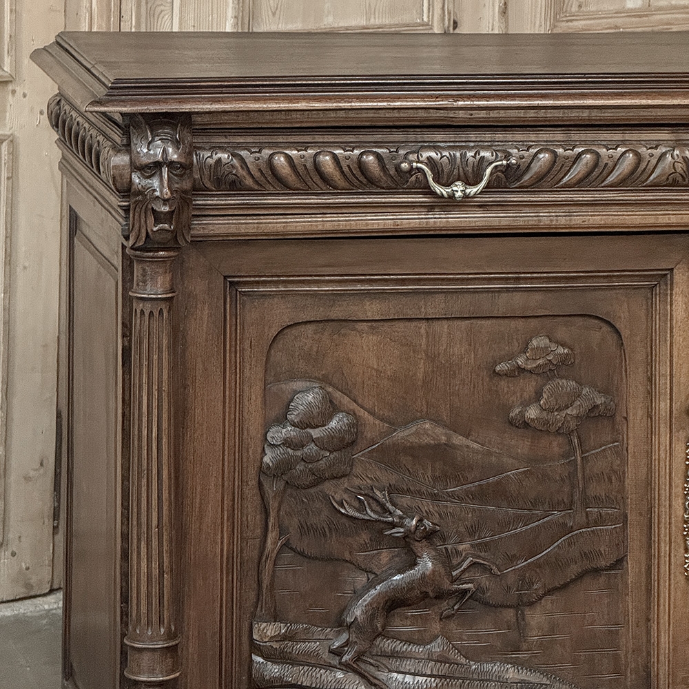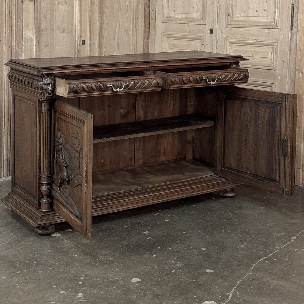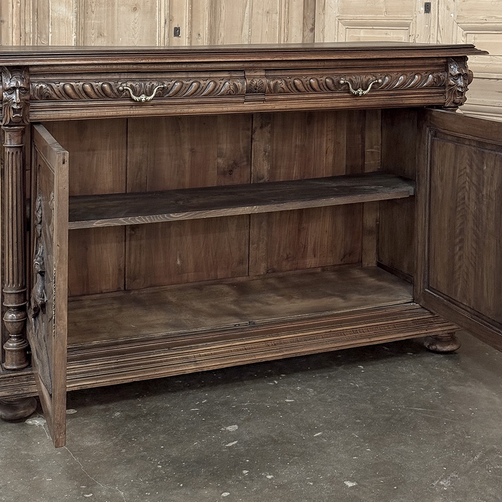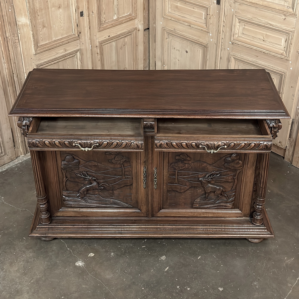 19th Century French Walnut Hunt Buffet ~ Credenza will make an excellent centerpiece for a masculine decor! Hand-crafted and sculpted from fine French walnut, it features a boldly molded top with a top drawer tier defined by a prominent stylized egg motif that even carries around each side. Atop each corner post is a smiling lion's head, and bronze bale pulls on each drawer complement the fancy key guards below. A pair of fluted columns frame the lower doors, whose carvings of stags steals the show, juxtaposed over a panoramic wooded mountainside. Doors open to reveal a full width shelf creating two big surfaces perfect for organized storage.