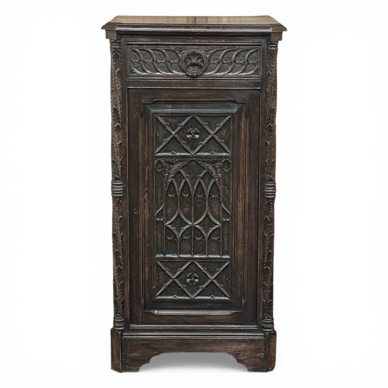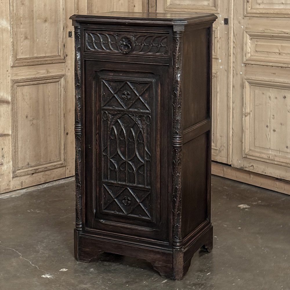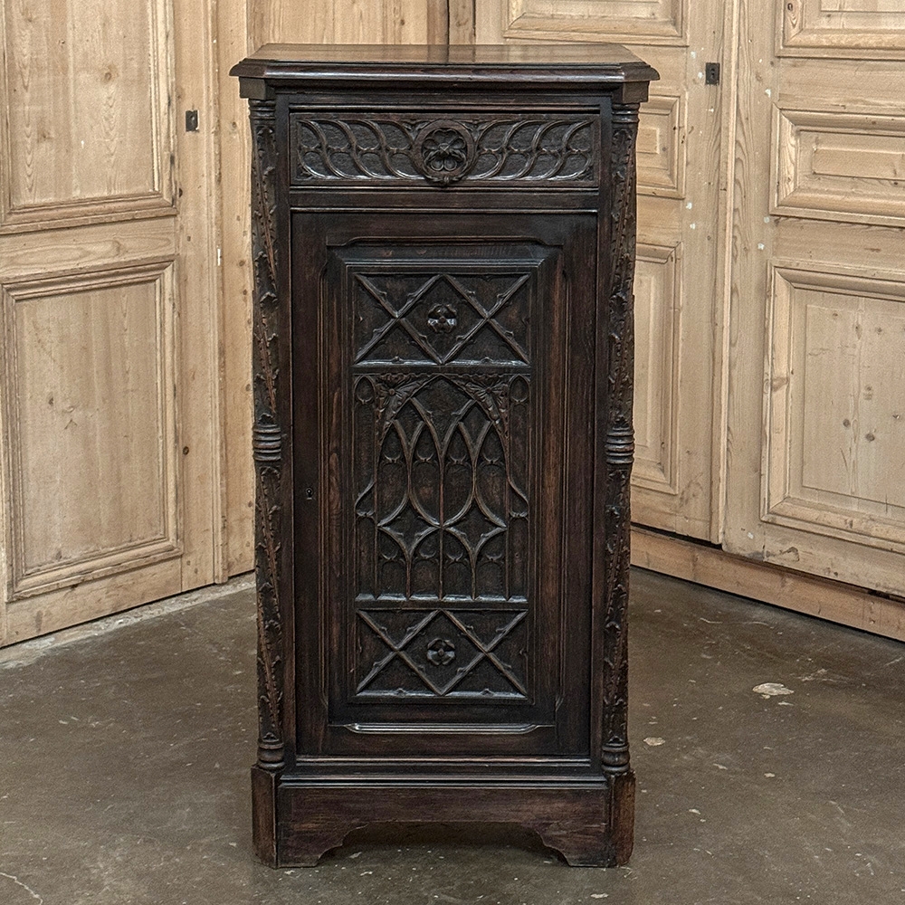 The upper frieze is defined by a rhythmic carved pattern centered with a rosette, bringing balance and order to the composition. Flanked by slender carved pilasters, the cabinet carries a confident verticality, while the paneled door reveals a disciplined interplay of geometric forms and Gothic arches, adding depth and character without excess.