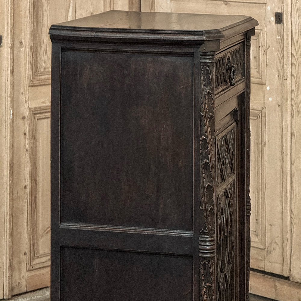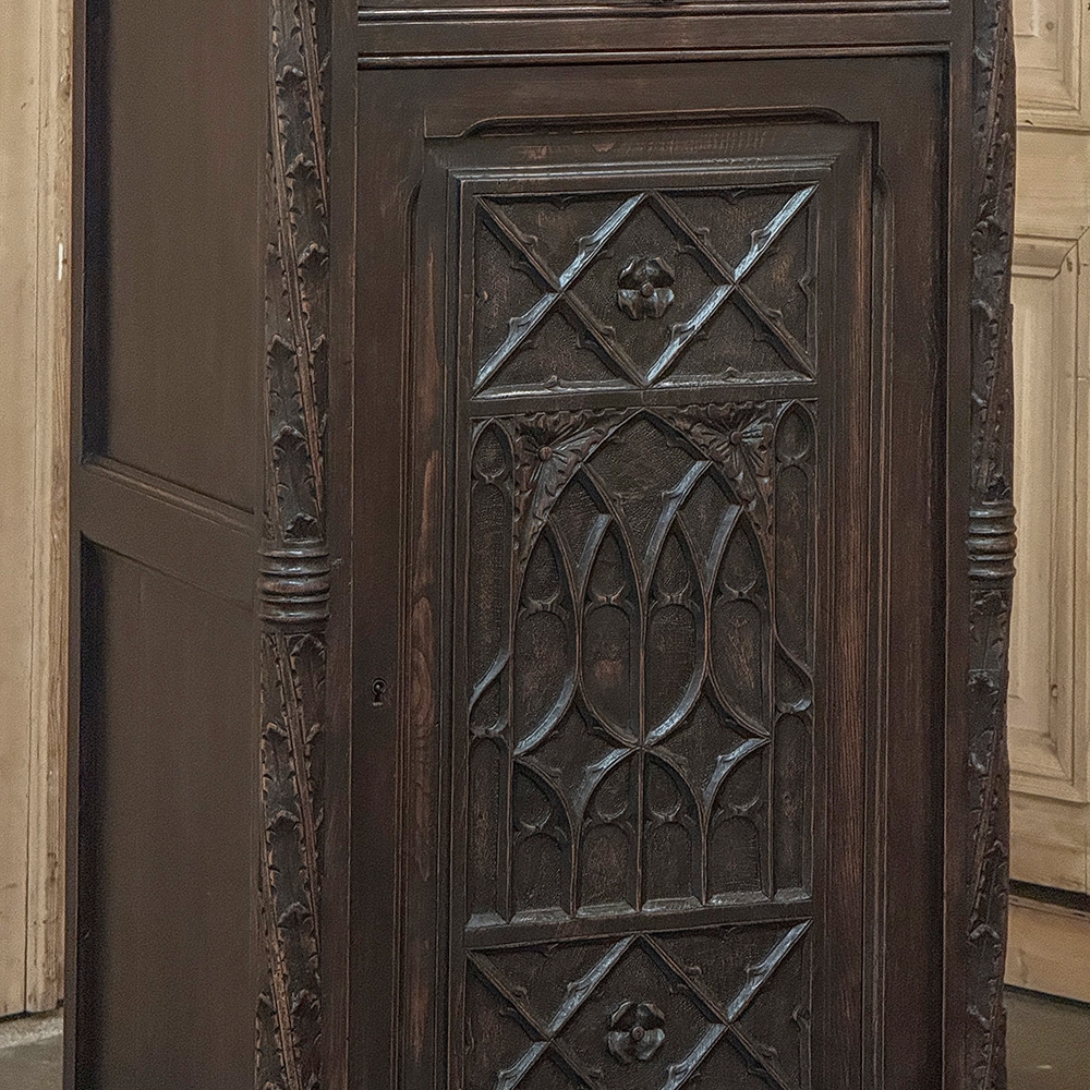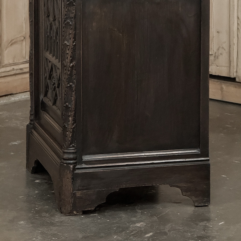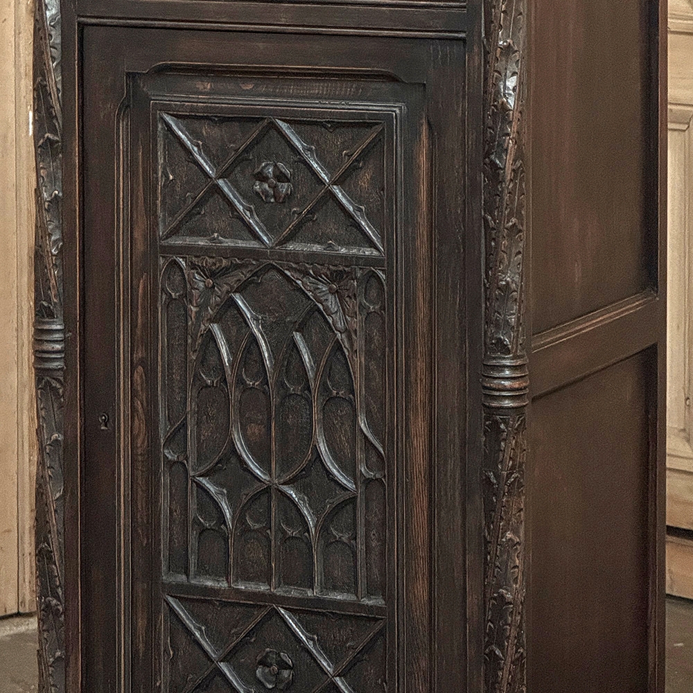 19th Century Gothic Oak Confiturier ~ Cabinet is a commanding example of Gothic Revival craftsmanship, carved in solid oak and presenting a strong architectural presence in a compact, highly functional form. The façade is structured with deeply recessed panels featuring intricate tracery, diamond motifs, and stylized floral carvings, all rooted in the enduring language of medieval design.