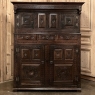 Sale18th Century Rustic Renaissance Two-Tiered Cabinet is the perfect solution for more storage in style! Hand-crafted from solid oak, it features a subtly recessed upper tier flanked by pendant finials, with cabinet doors that open to reveal perfect spaces for smaller items. The upper tier rests on the lower cabinet, fitted with three nicely-sized drawers and two yawning cabinet doors that open to reveal amazing storage below. The shelves in the lower section are curved slightly for ease of access. Carved embellishments appear all across the front, with stylized sunburst, demilune, rosette, pinwheel, and a variety of bordering motifs. Serpentine steel hinges hang the doors, with horseshoe shaped bale pulls for all the cabinets and doors. Six chamfered recessed panels adorn each side, with just a modicum of intaglio carved accents making it visually appealing from all angles!