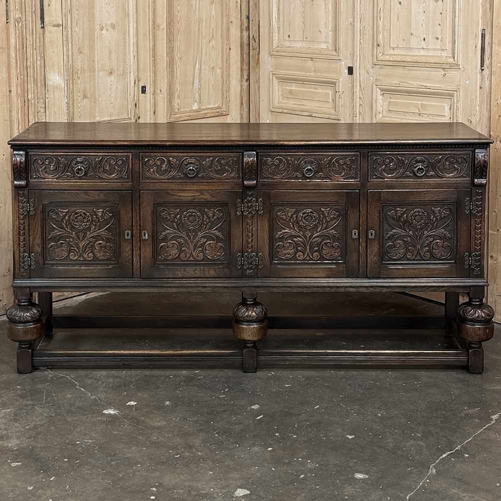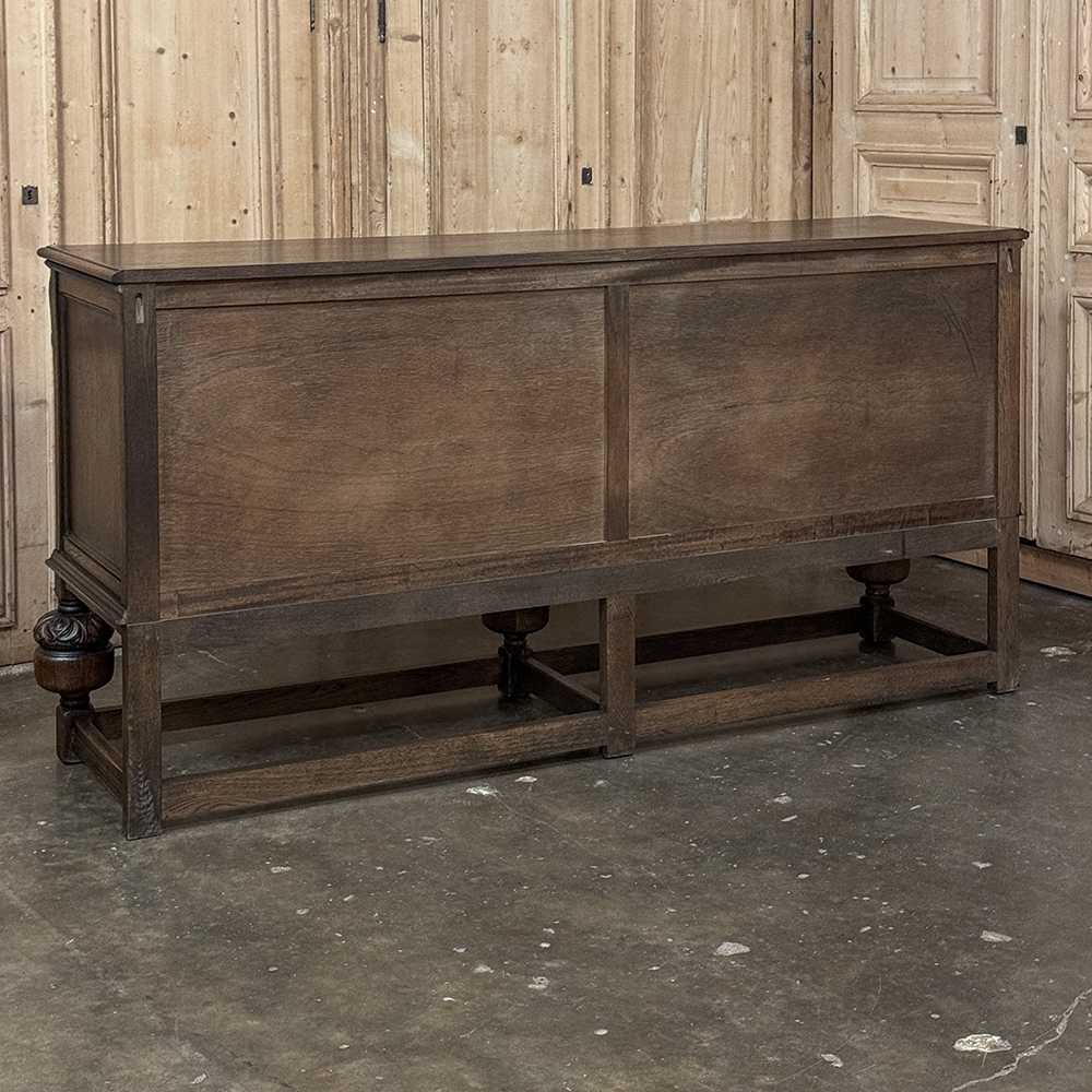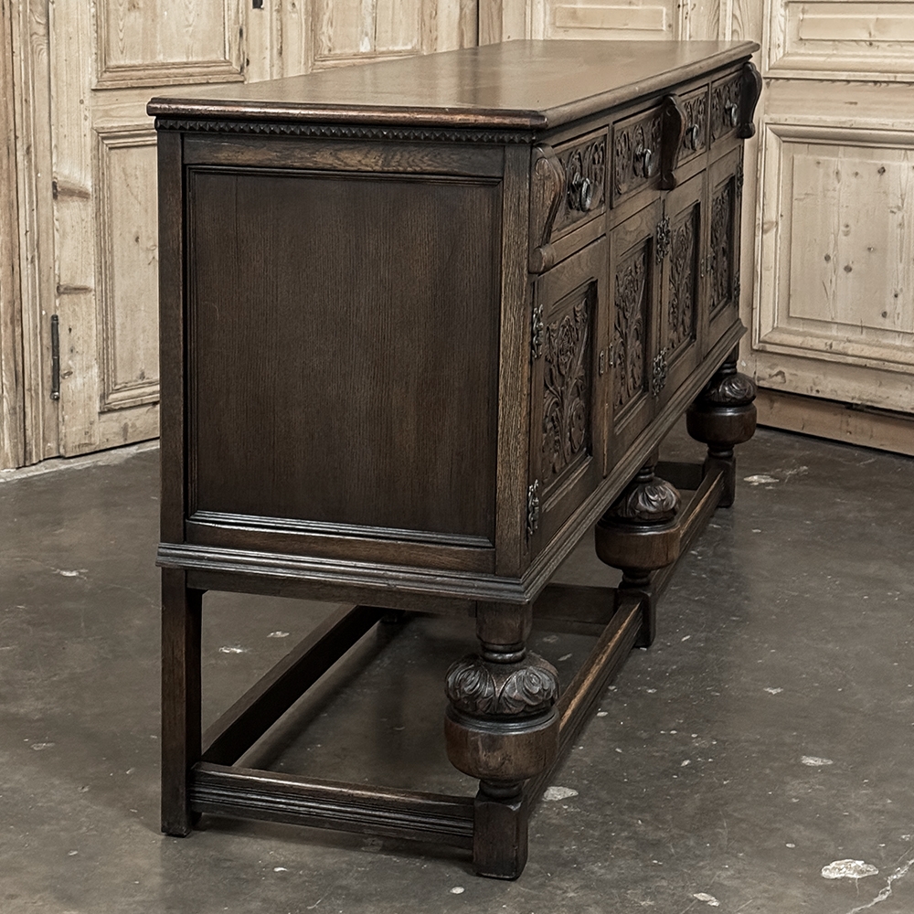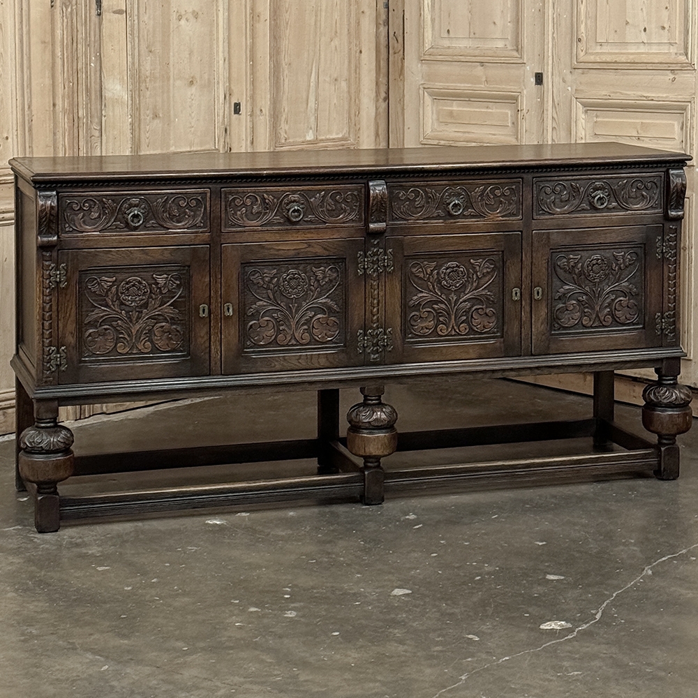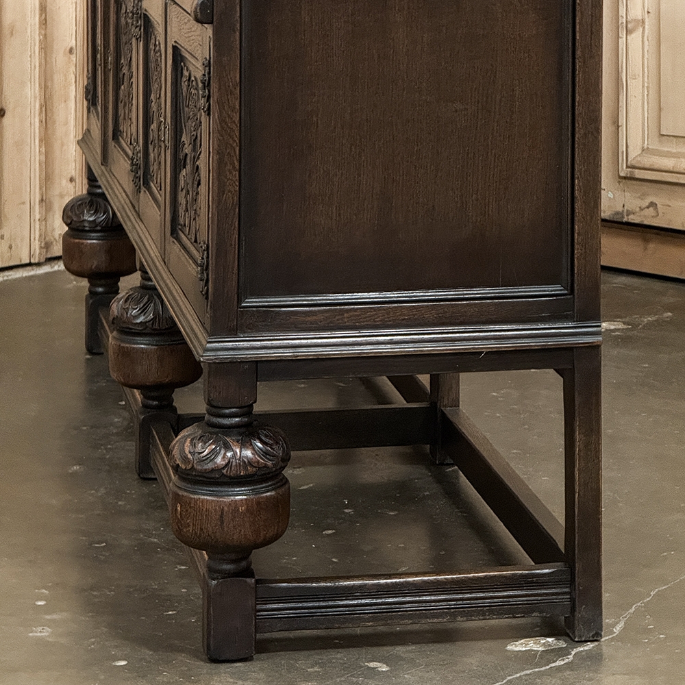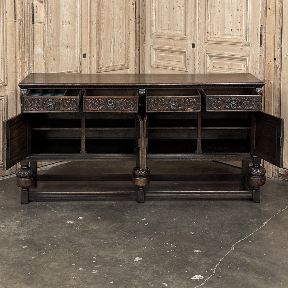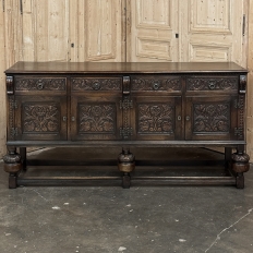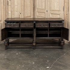 Antique French Renaissance Revival Raised Buffet ~ Credenza will make a splendid addition to any wall! Hand-crafted from solid oak, it features a plank top below which reside four drawers between three corbels, which in turn appear over four doors, all on raised acorn urns for easy access. The drawers and doors are all carved with fanciful foliate designs in bas relief, creating visual appeal you notice across the room. Convenient shelves in the compartments, and dividers with velvet in the left most drawer all add to the functionality. Cast brass ring pulls and key guards with brass hinges complete the look.
