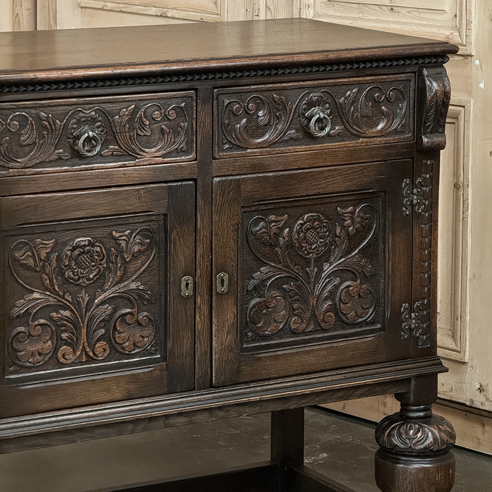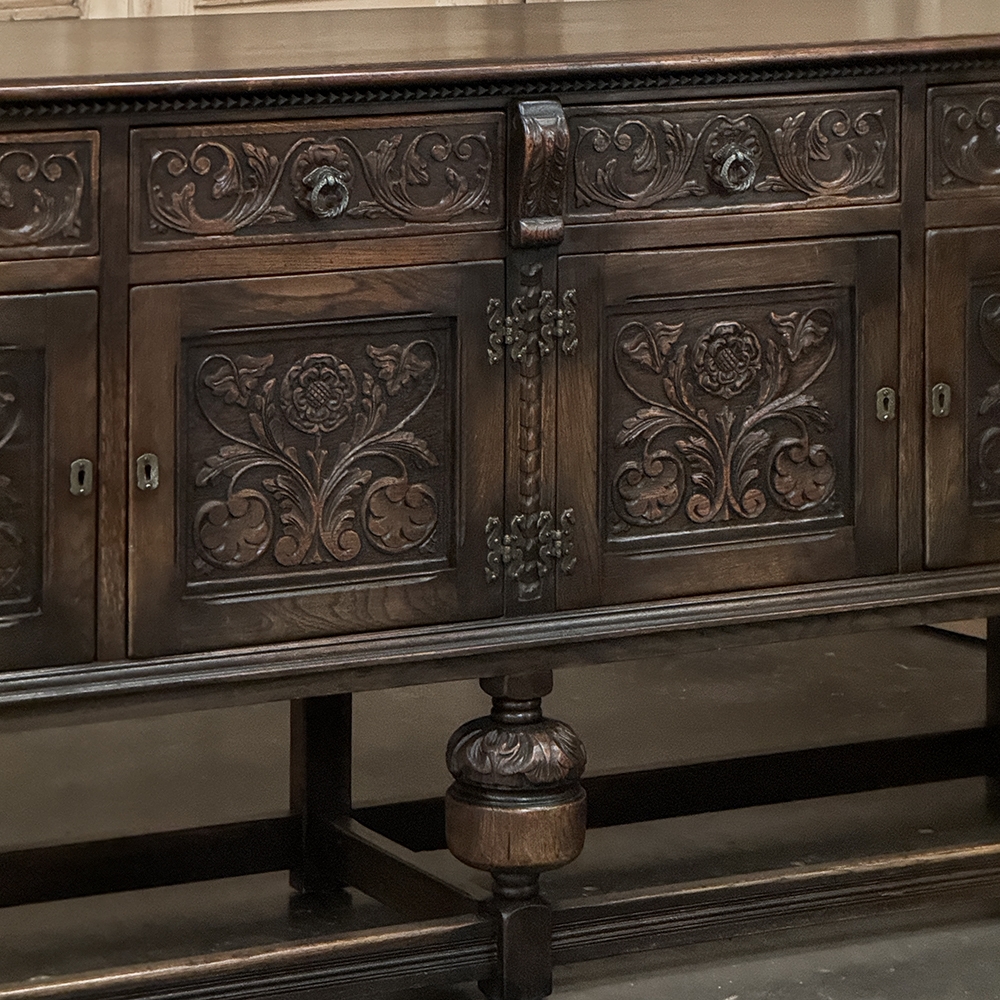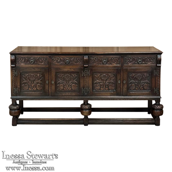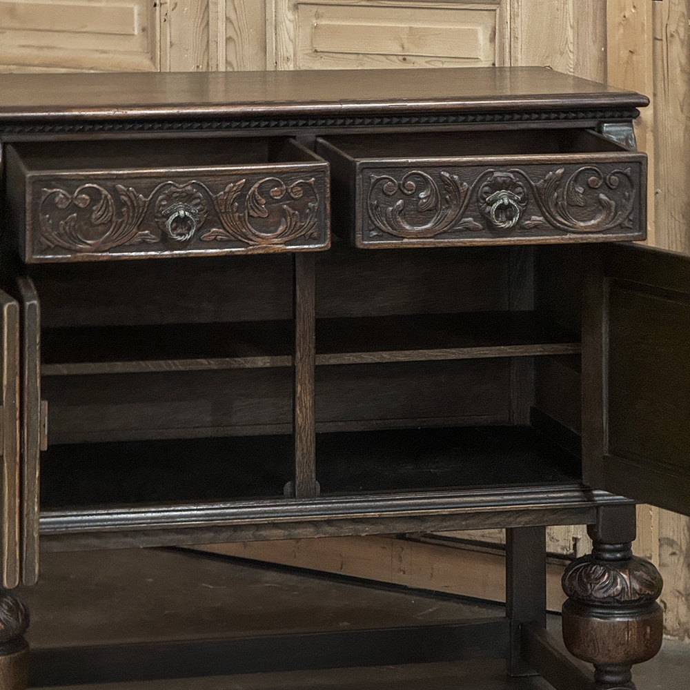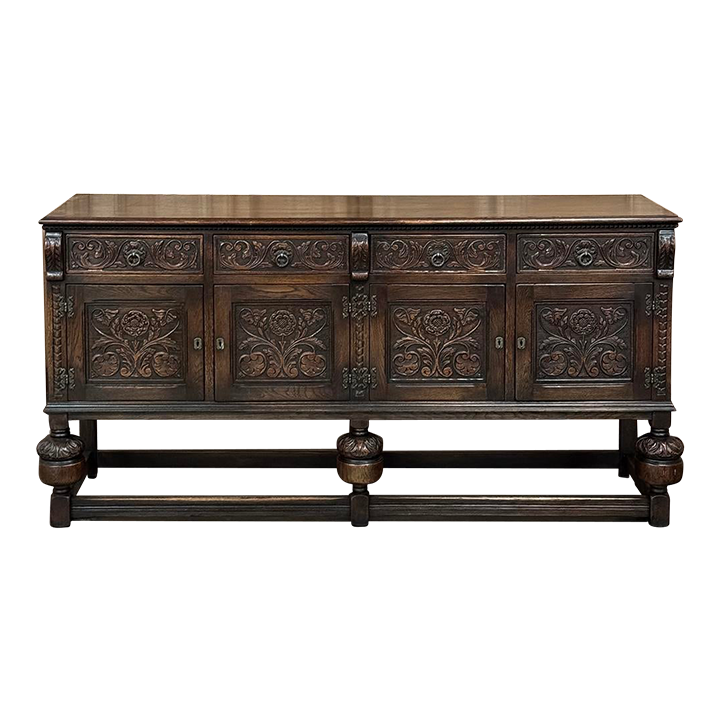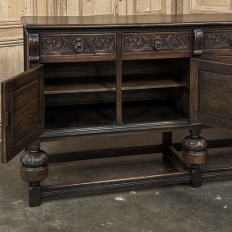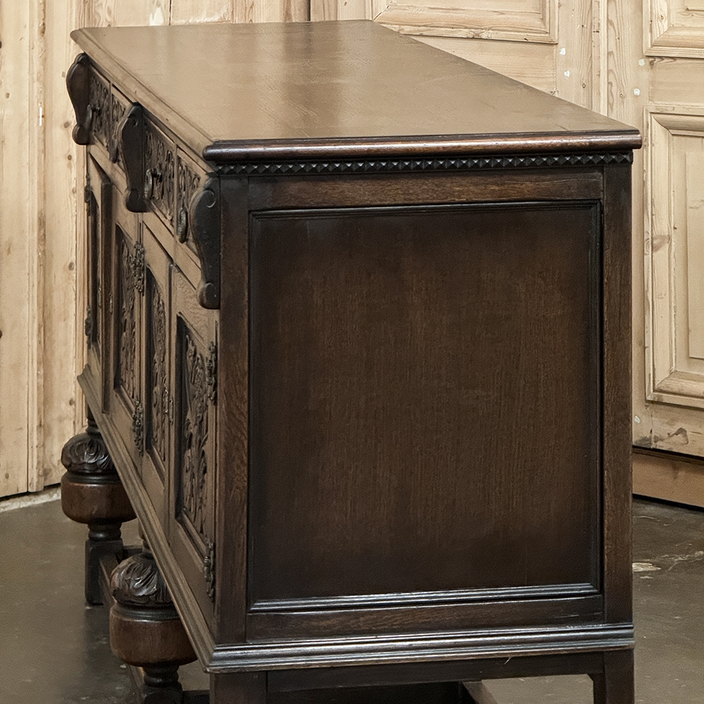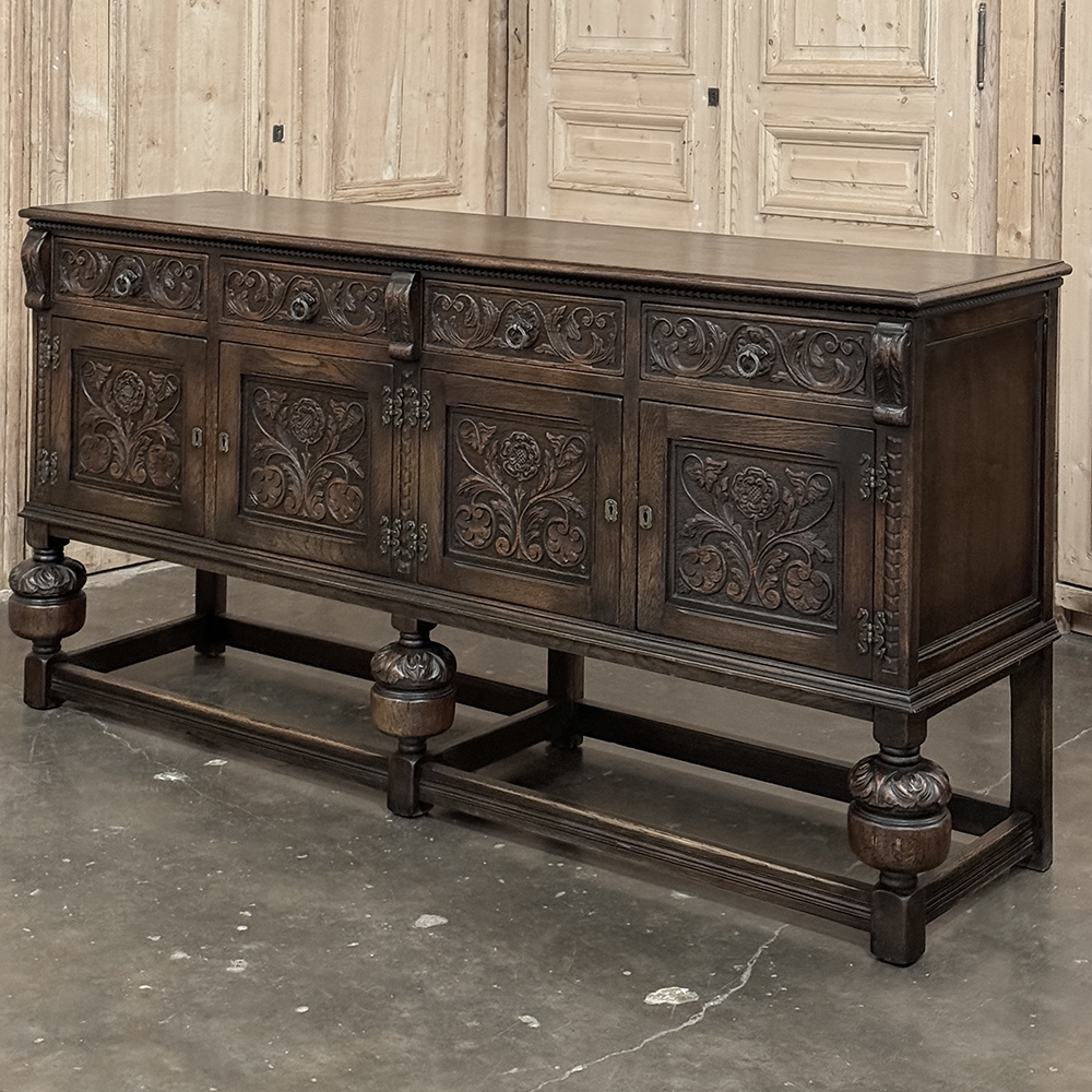 Antique French Renaissance Revival Raised Buffet ~ Credenza will make a splendid addition to any wall! Hand-crafted from solid oak, it features a plank top below which reside four drawers between three corbels, which in turn appear over four doors, all on raised acorn urns for easy access. The drawers and doors are all carved with fanciful foliate designs in bas relief, creating visual appeal you notice across the room. Convenient shelves in the compartments, and dividers with velvet in the left most drawer all add to the functionality. Cast brass ring pulls and key guards with brass hinges complete the look.