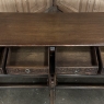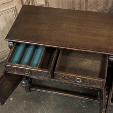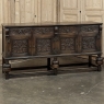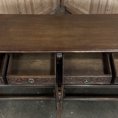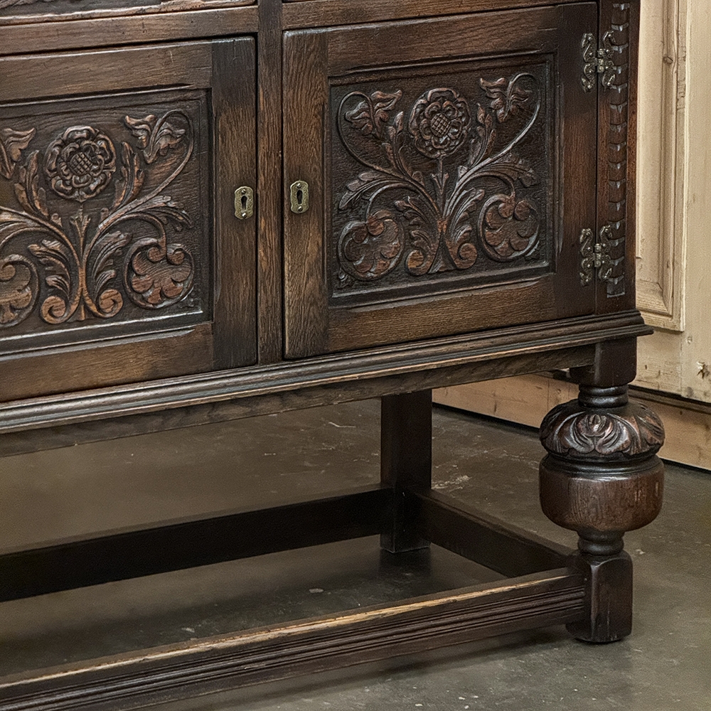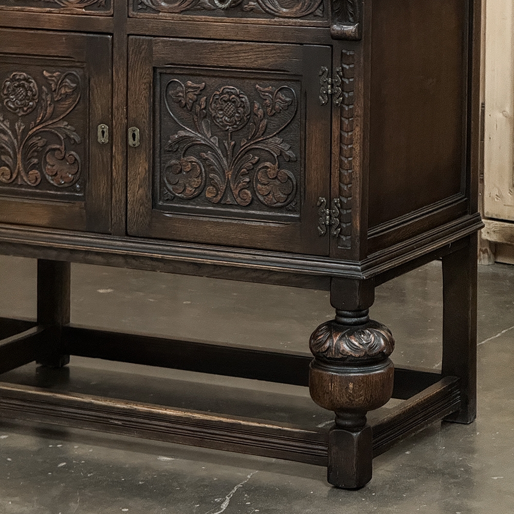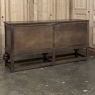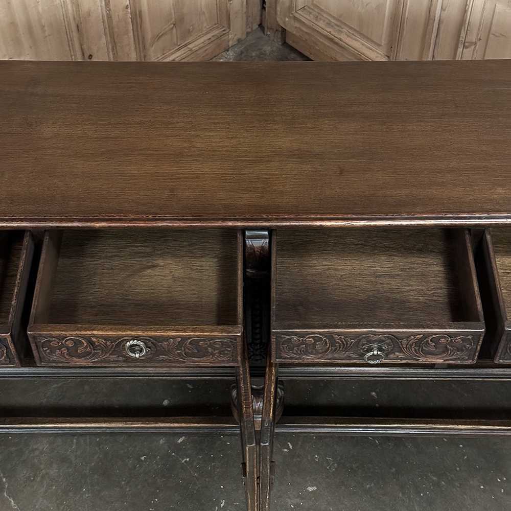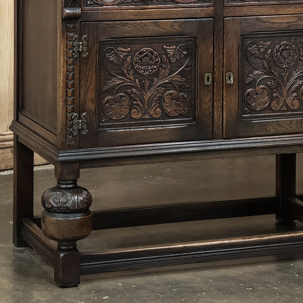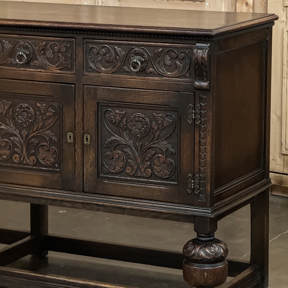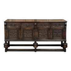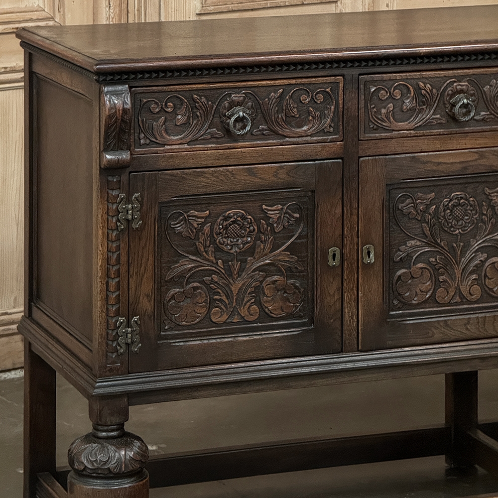 Antique French Renaissance Revival Raised Buffet ~ Credenza will make a splendid addition to any wall! Hand-crafted from solid oak, it features a plank top below which reside four drawers between three corbels, which in turn appear over four doors, all on raised acorn urns for easy access. The drawers and doors are all carved with fanciful foliate designs in bas relief, creating visual appeal you notice across the room. Convenient shelves in the compartments, and dividers with velvet in the left most drawer all add to the functionality. Cast brass ring pulls and key guards with brass hinges complete the look.