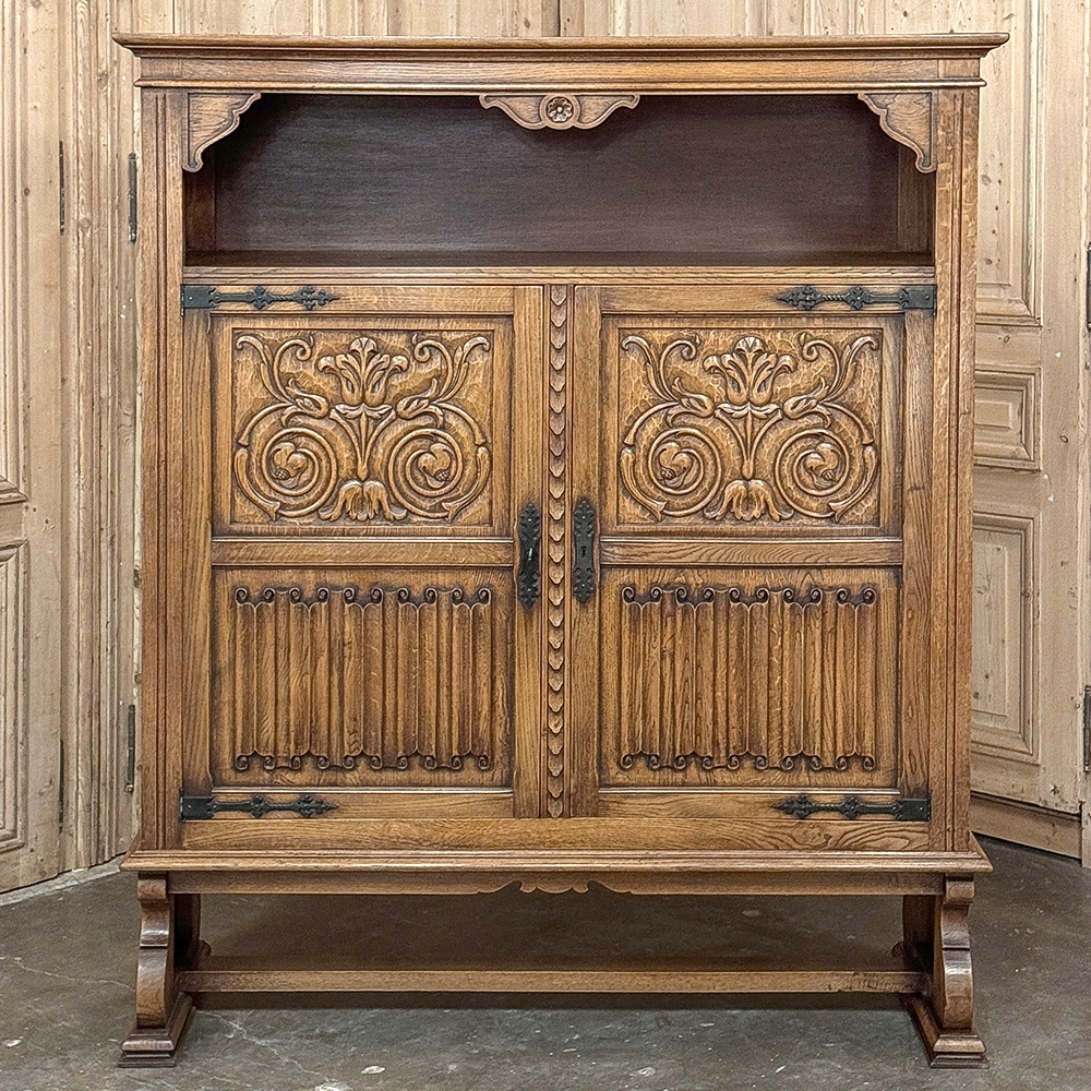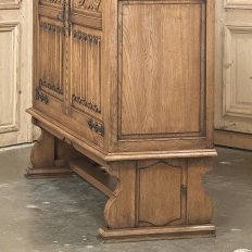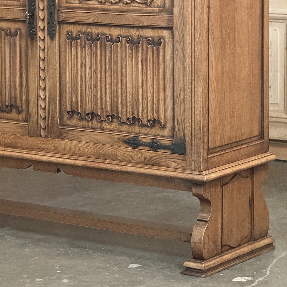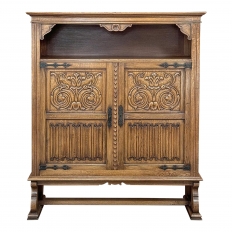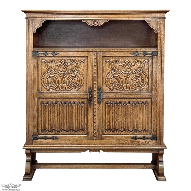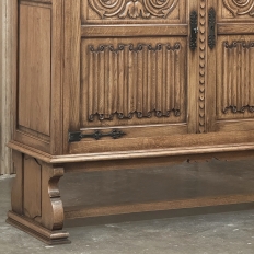 Antique Gothic Raised Cabinet ~ Linen Press will make an excellent storage piece for any room! Raised up on a platform with solid supports on both sides for ease of access, it features two big doors that open to reveal three surfaces, with a bonus open shelf on top that is framed with carved corbels. At the very top which is 3.5" under six feet off the ground, another display surface presents itself surrounded by fine crown molding. The doors, however, steal the show with interesting scroll and foliate patterns carved into the upper panels, and linenfold carved into the lower panels, accentuated by steel strap hinges and interesting key guards. Great for storing anything from toys to clothes, to dining room linens, even a good choice as a bookcase!