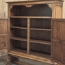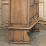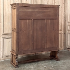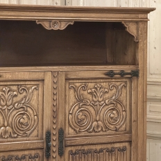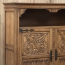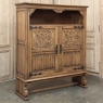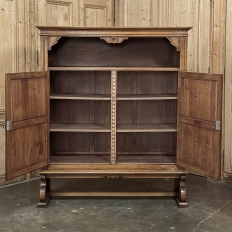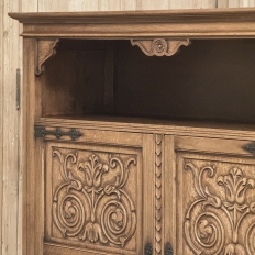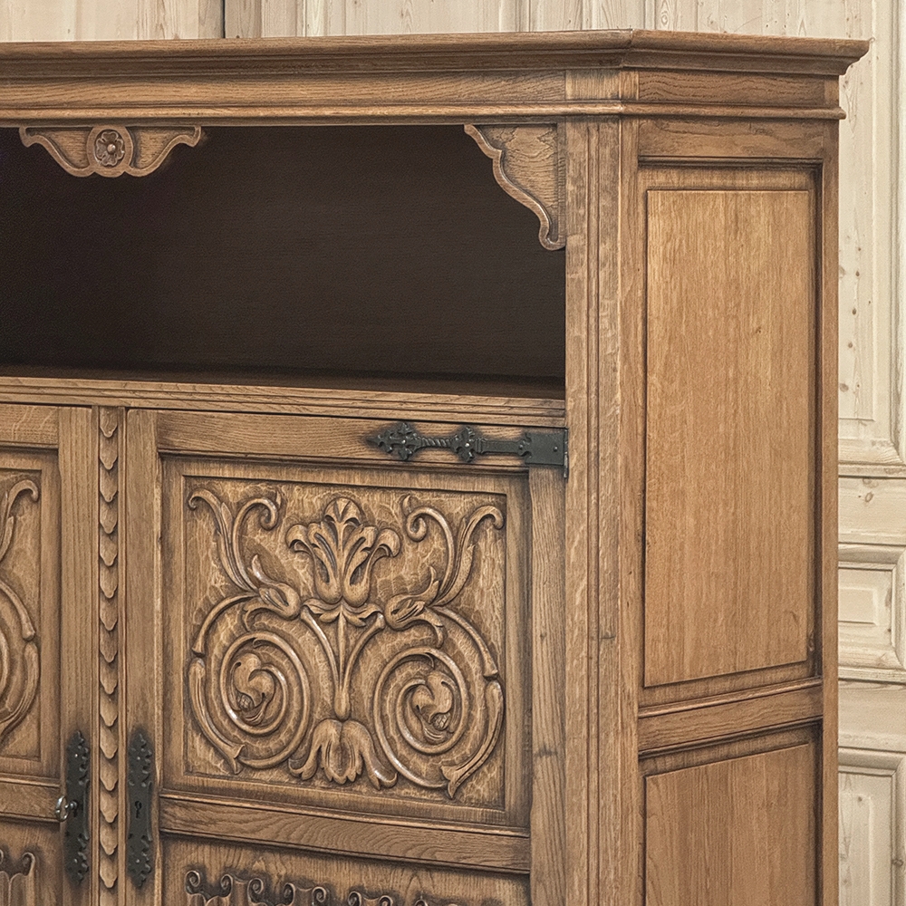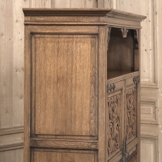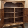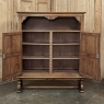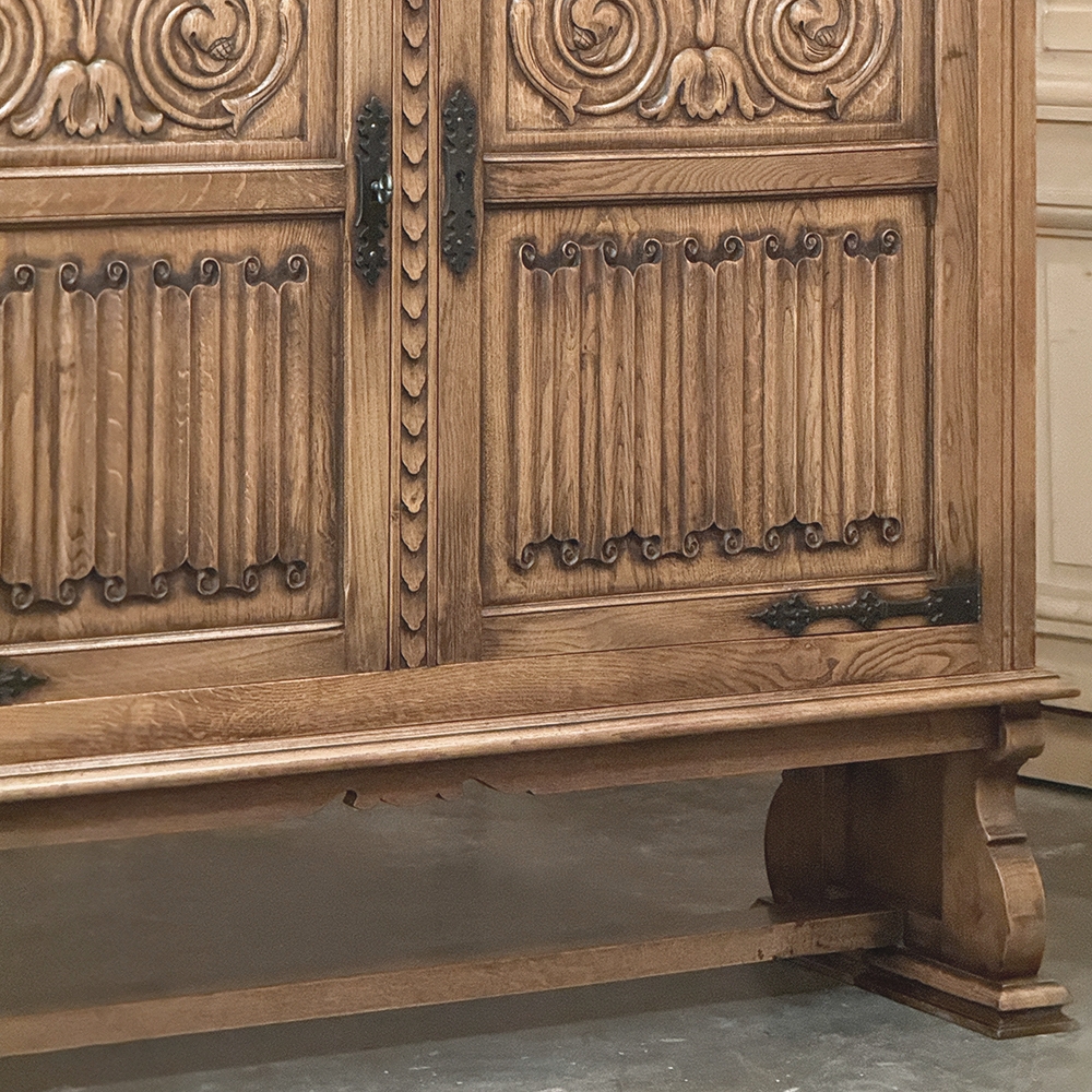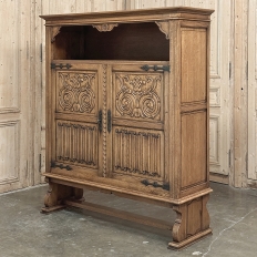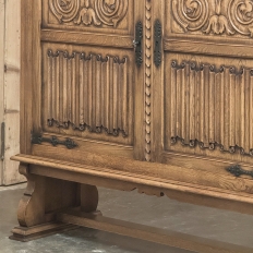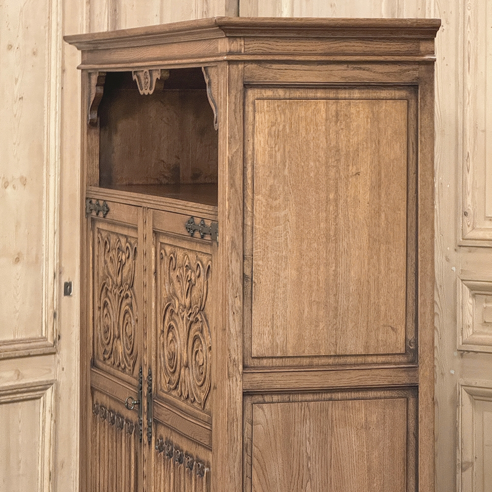 Antique Gothic Raised Cabinet ~ Linen Press will make an excellent storage piece for any room! Raised up on a platform with solid supports on both sides for ease of access, it features two big doors that open to reveal three surfaces, with a bonus open shelf on top that is framed with carved corbels. At the very top which is 3.5" under six feet off the ground, another display surface presents itself surrounded by fine crown molding. The doors, however, steal the show with interesting scroll and foliate patterns carved into the upper panels, and linenfold carved into the lower panels, accentuated by steel strap hinges and interesting key guards. Great for storing anything from toys to clothes, to dining room linens, even a good choice as a bookcase!
