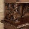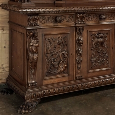 Antique Grand Italian Renaissance Two-Tier Buffet in Walnut will make an unforgettable statement in your family room, dining room or entertainment room! The carved detail from top to bottom must be seen in person to be fully appreciated, but we will make an humble attempt to expound upon it. The upper tier is boldly molded on top with a foliate-carved bonnet flanked by acanthus leaf corbels, which is situated above four cabinet doors flanked with classical figures on each side in bold full relief. The outermost of the four upper cabinet doors feature angelic faces surrounded by stylized foliate detail, with the inner two complementing the same surround but centered with figures in different poses. The sphinx-like supports on each side envelope the serving surface, backed by intricately carved panels with two corbels carved with gargoyles adding visual interest. Fishscale bordering around the top of the serving surface overlooks three spacious drawers with carved facades and large carved pulls. The drawer tier appears over the four cabinet doors below, which are flanked by more sculptural figures, with the doors carved with gryffins and elaborate stylized foliate detail. A bold base with large lions' paw feet completes the design.