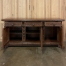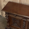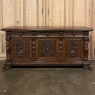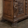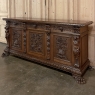 Antique Grand Italian Renaissance Walnut Buffet will make an unforgettable statement in your family room or entertainment room! Crafted from select walnut in its entirety, its impressive carved and sculpted detail is too abundant to fully cover herein, but we will try! Fishscale bordering over dentil molding wraps around the edge of the serving surface and overlooks three spacious drawers with carved facades and large carved pulls. Each drawer is framed by boldly carved acanthus plume corbels. The drawer tier appears over three cabinet doors below, which are flanked by more sculptural figures and separated by bold foliate pilasters. The two outer doors are carved with amazingly artistic stylized shells in bold relief surrounded by fanciful foliates and floral detail. The center panel continues the theme of the foliate and floral designs but surrounds a phoenix with outspread wings. A bold base with large lions' paw feet completes the design.
