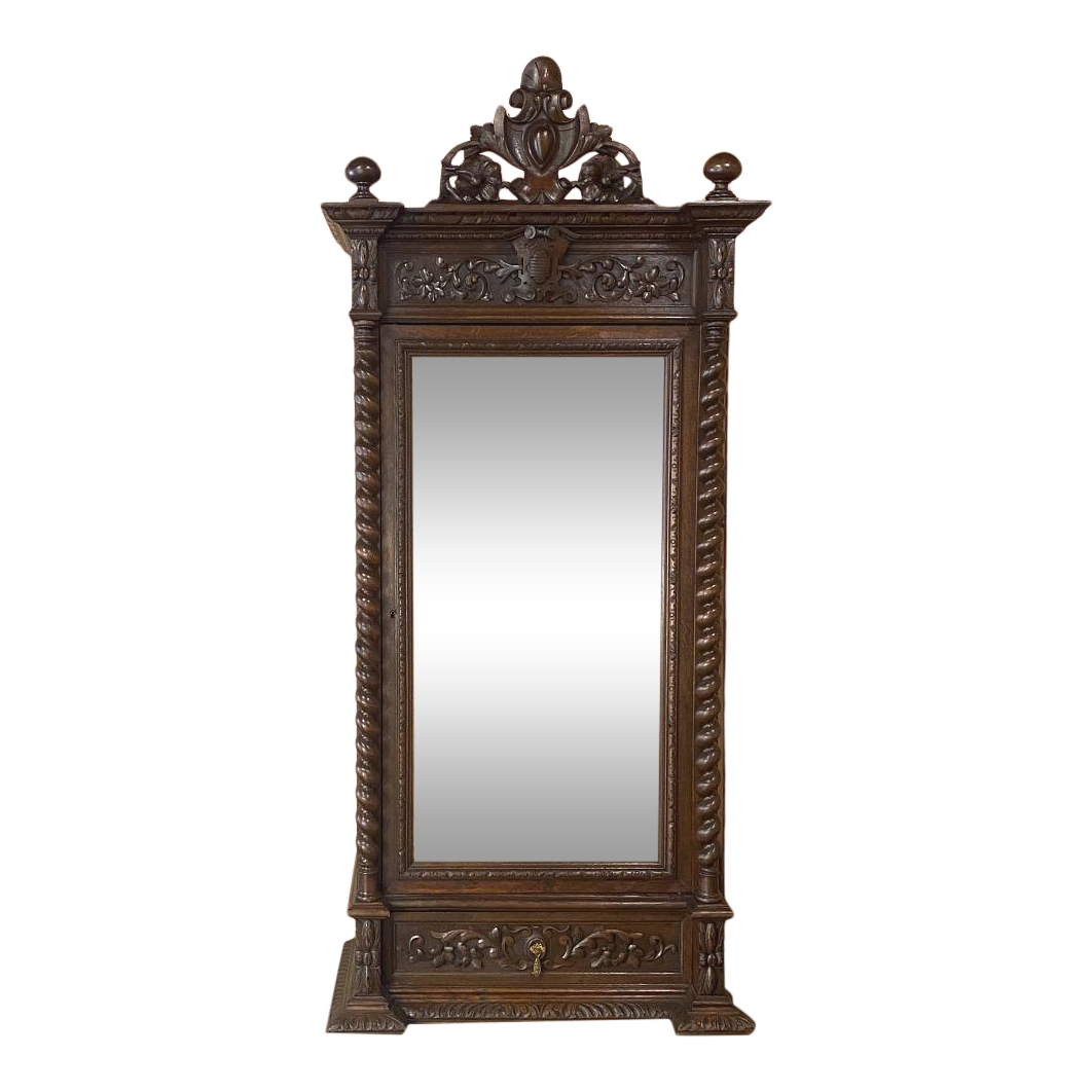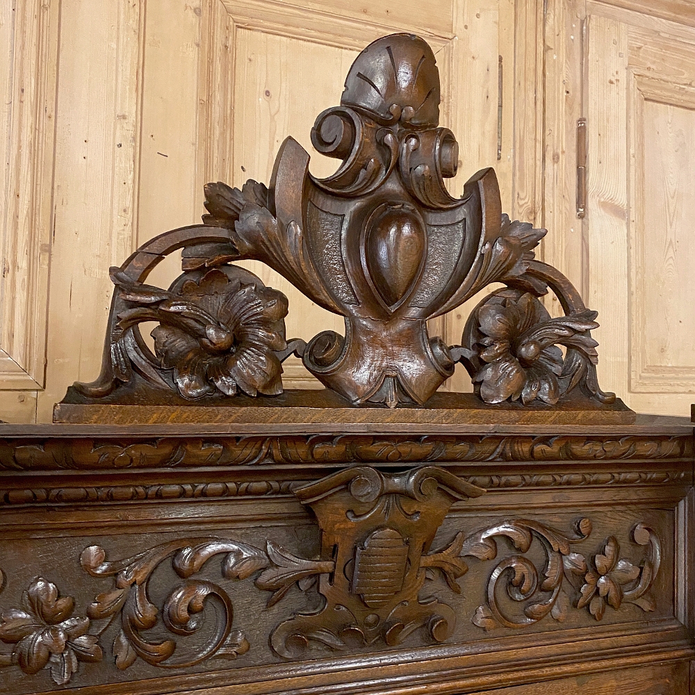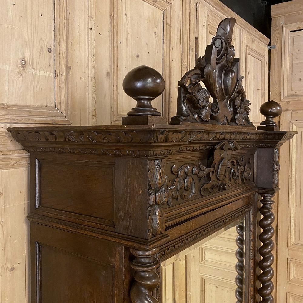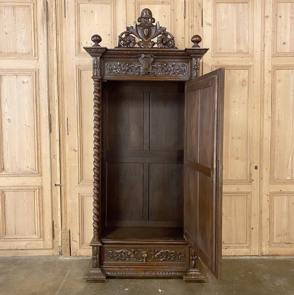 Sale19th Century French Renaissance Barley Twist Armoire was crafted by master artisans from solid, old-growth indigenous oak during the Napoleon III Period, when craftsmanship reached a plateau of quality recognized the world over! The amazing heraldic crest atop the crown, which features its own version of a crest, are both nestled amongst artfully sculpted acanthus plumes, foliage and flower motifs, then framed with several variations of classical molding. Two impressive ball finials flank the crown, and are positioned above the bold molding just above a vertical rosette, followed by full length barley twist columns that extend all the way down to the bottom of the centered door. The door is fitted with its original beveled mirror which has been exquisitely preserved. Below all that lies the base with its repeating vertical rosettes on each corner providing a framework for the exquisite relief carving on the full width drawer, and multiple tiers of molding emanating out towards the floor. The door opens to reveal a nicely spacious interior, ready to adapt to your purposes.