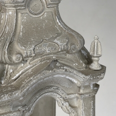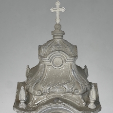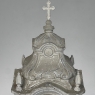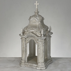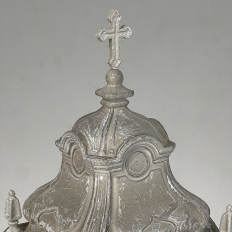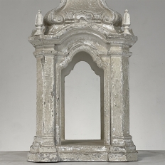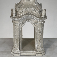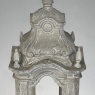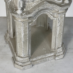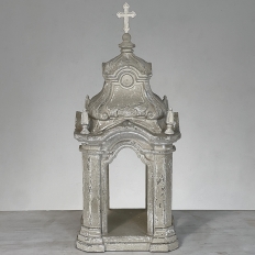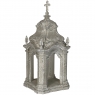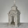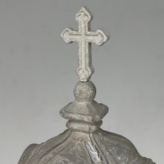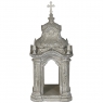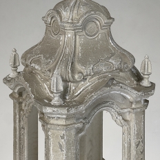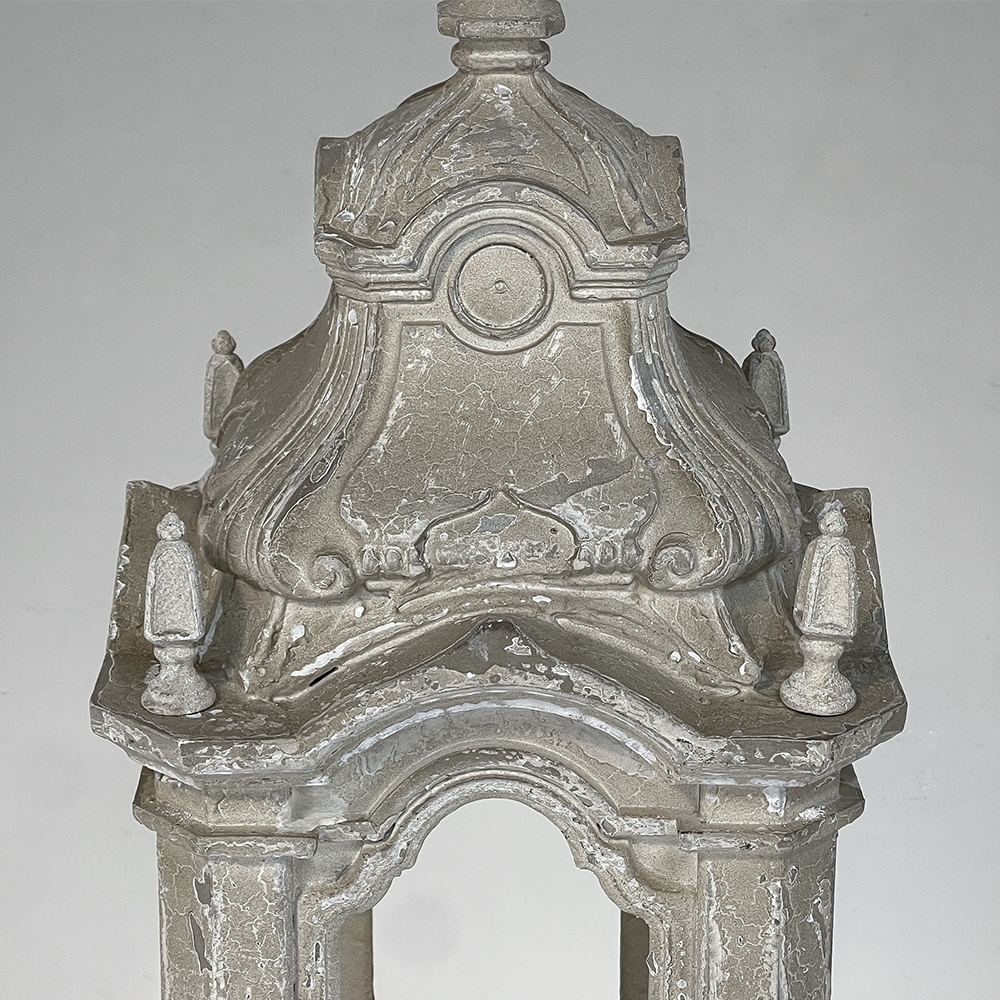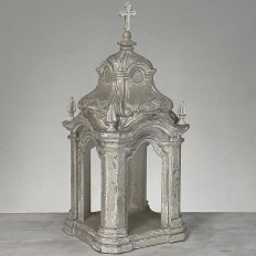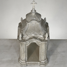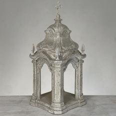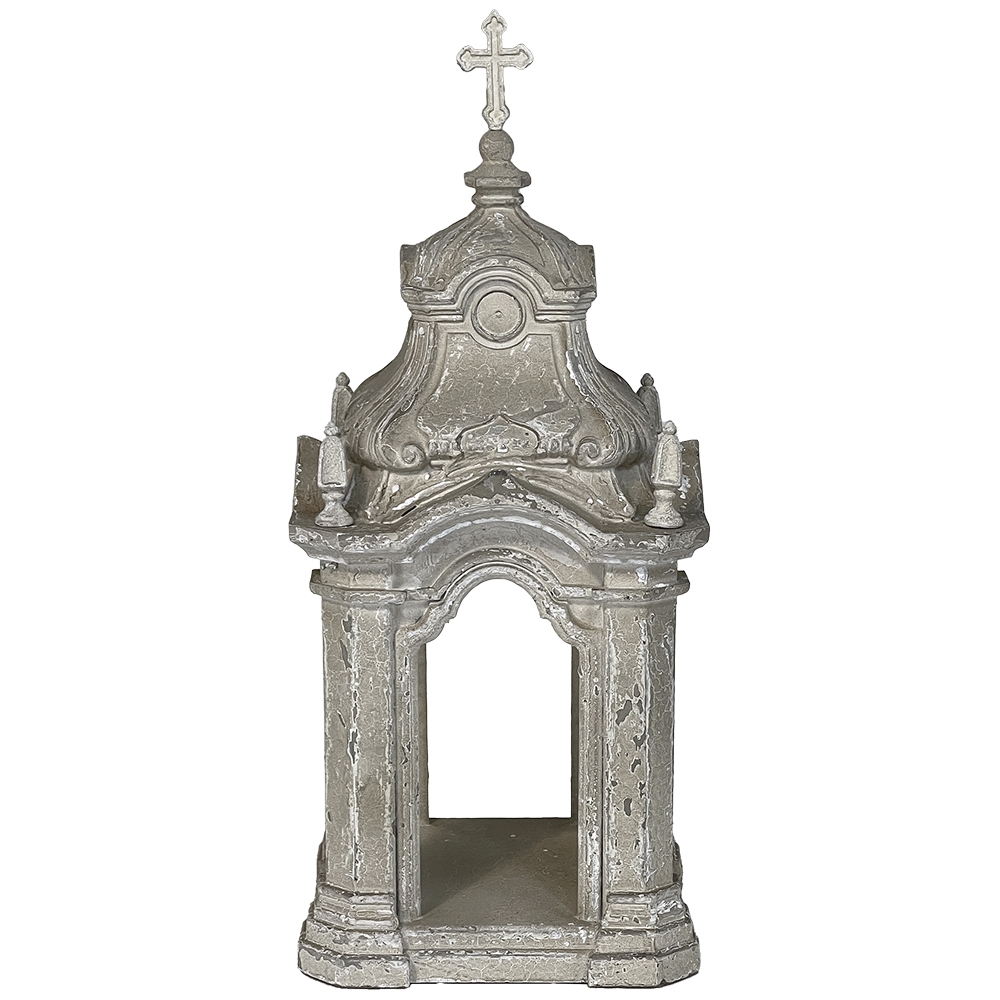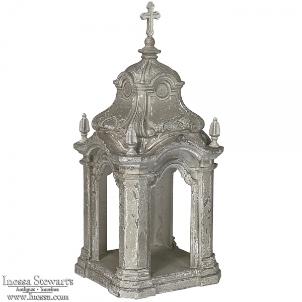 Display Centerpiece ~ Shrine with Distressed Painted Finish combines elegant Baroque-inspired architecture topped with four finials on each corner and a cross at the very top, The roof is a contoured dome reminiscent of the architecture of Pairs, with arched openings framed by faceted cornerposts allowing one to display statuary or other objet d'art inside. An additional design is available; see Related Products below left.