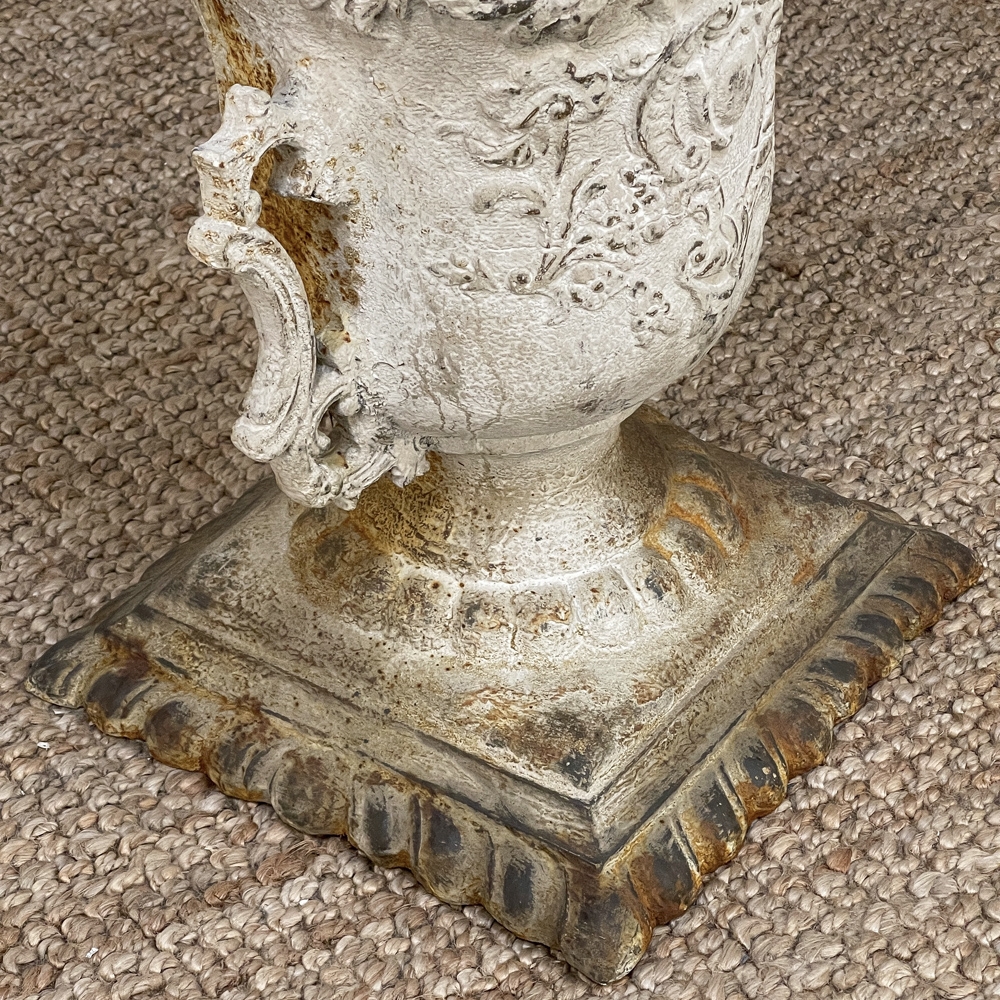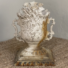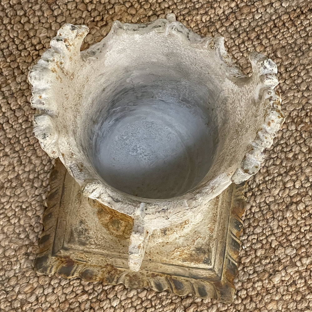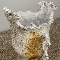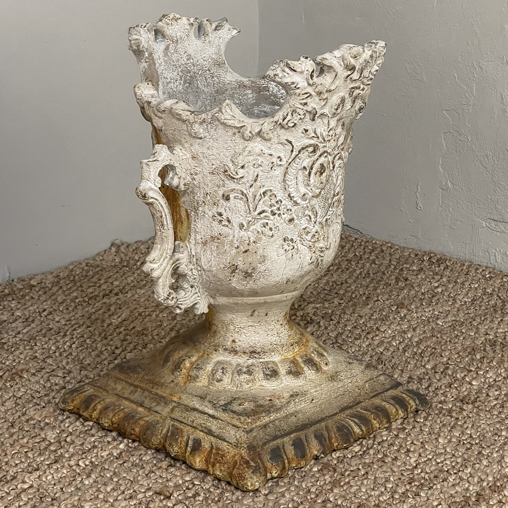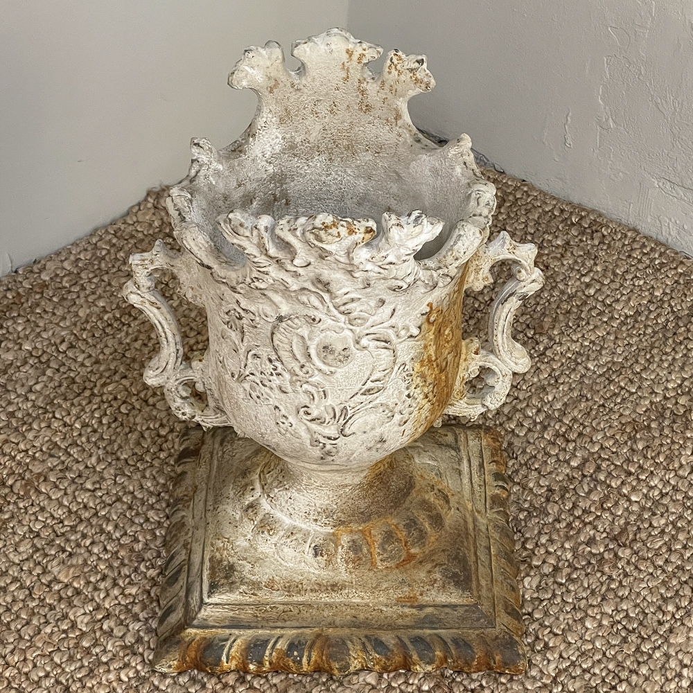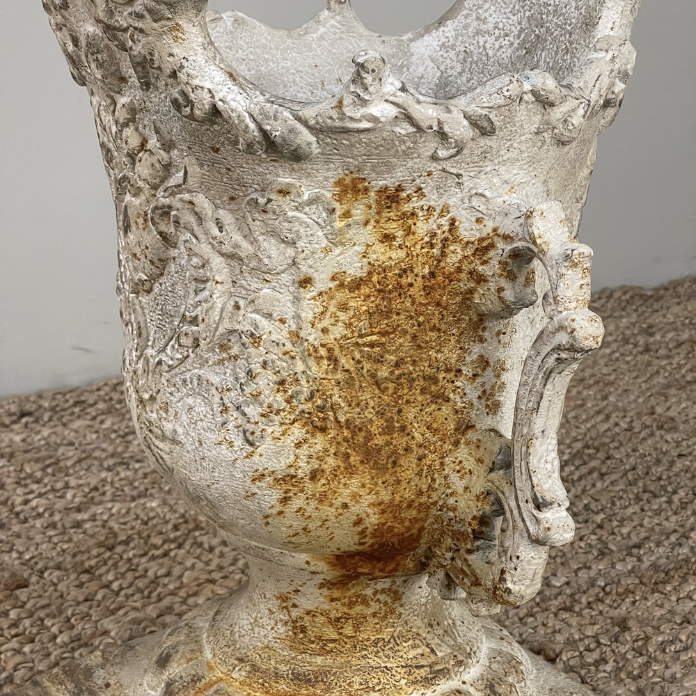 Embossed Tin Baroque Garden Urn with Aged Finish was given a classic form with embellished rim and features intricate detailing to create a wonderful focal point in the garden, outdoor entertaining area or solarium. Of course, this piece can be used inside as an eye-catching centerpiece or vase as well. Crafted from tin and given an aged whitewashed finish, it is ready to provide a neoclassical accent to any setting!