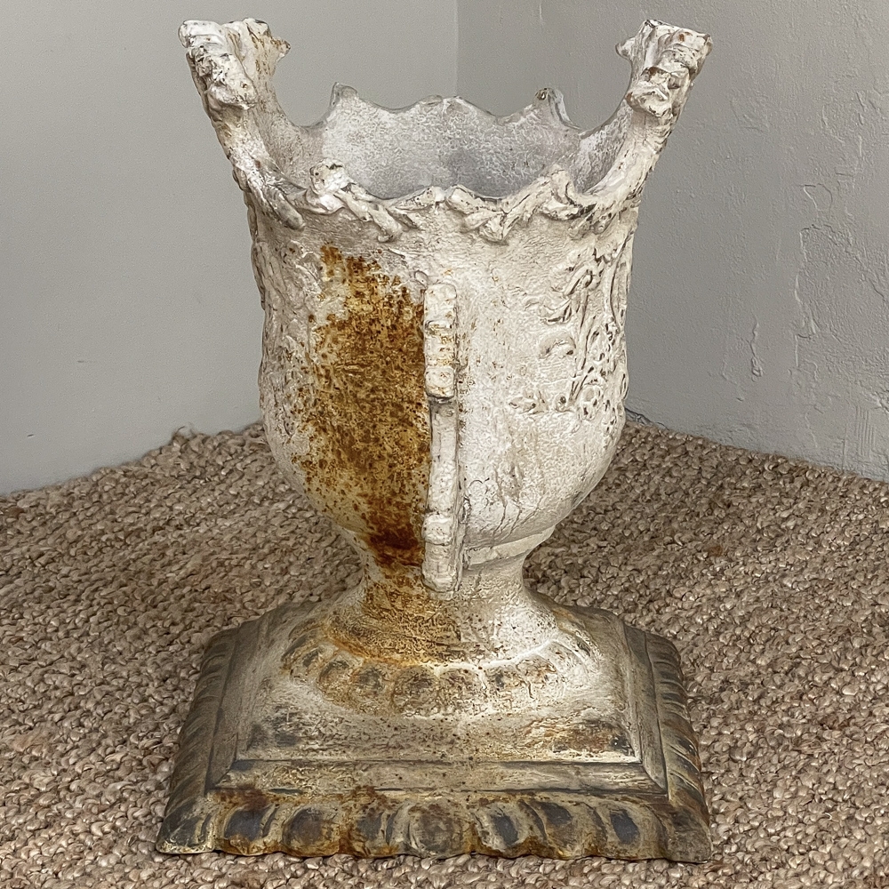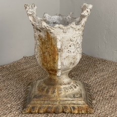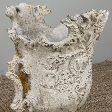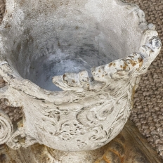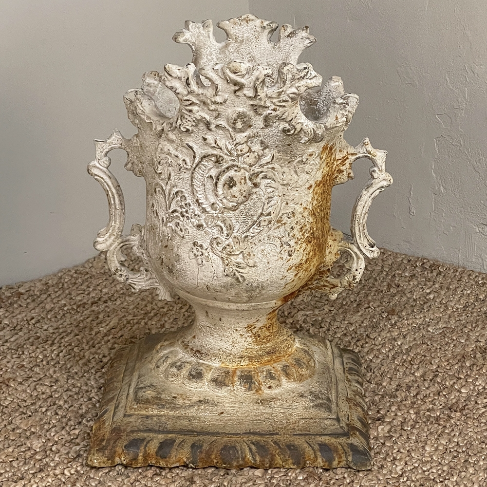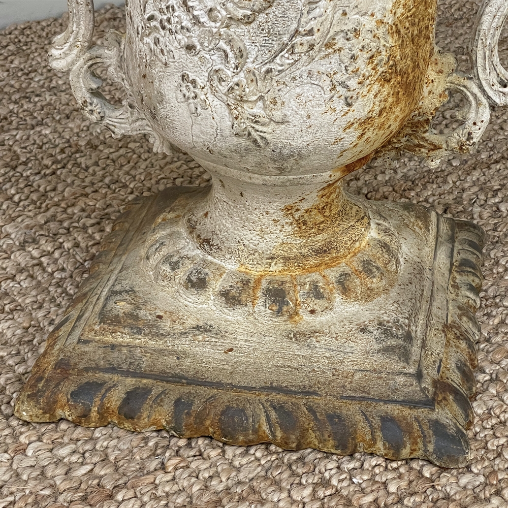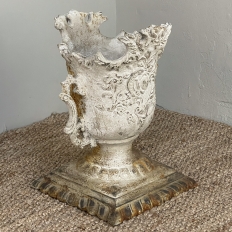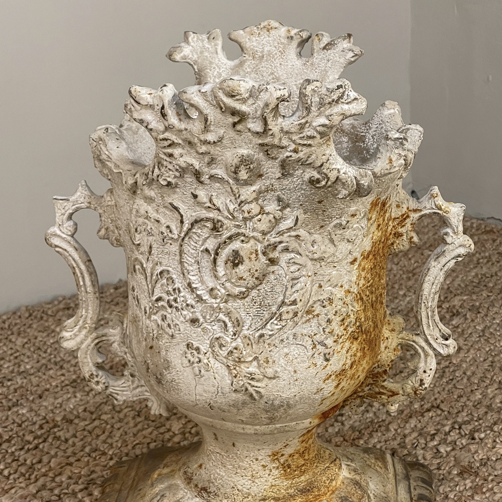 Embossed Tin Baroque Garden Urn with Aged Finish was given a classic form with embellished rim and features intricate detailing to create a wonderful focal point in the garden, outdoor entertaining area or solarium. Of course, this piece can be used inside as an eye-catching centerpiece or vase as well. Crafted from tin and given an aged whitewashed finish, it is ready to provide a neoclassical accent to any setting!