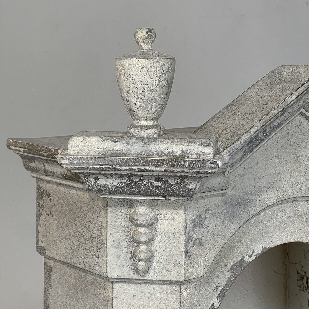 Reproduction Decorative Shrine ~ Niche with Distressed Painted Finish is a charming way to provide an Old World look that has the panache of an antique, but in a newly produced replica. Ideal for displaying statuary or a special objet d'art, its appearance is enhanced by the carefully applied multi-step painted finish which enhances the bold molding detail with mitered corners, half-turnings and urn finials as finishing touches.