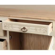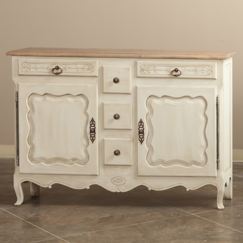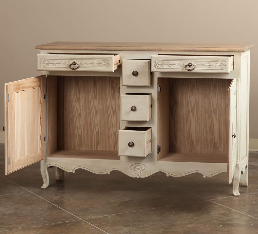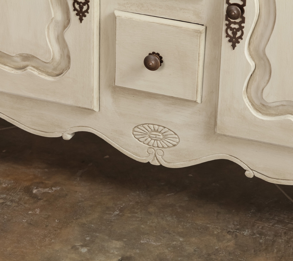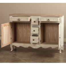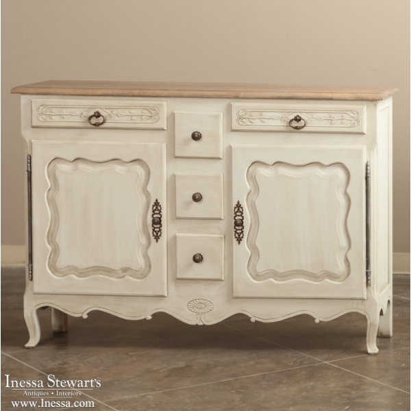FINAL SALE! ~ Providing the perfect casual solution for today's dining areas and breakfast room, this buffet features a Country French charm with shallow depth yet a lot of storage behind the two doors and in the drawers. Subtly patinaed painted finish completes the look.