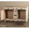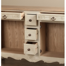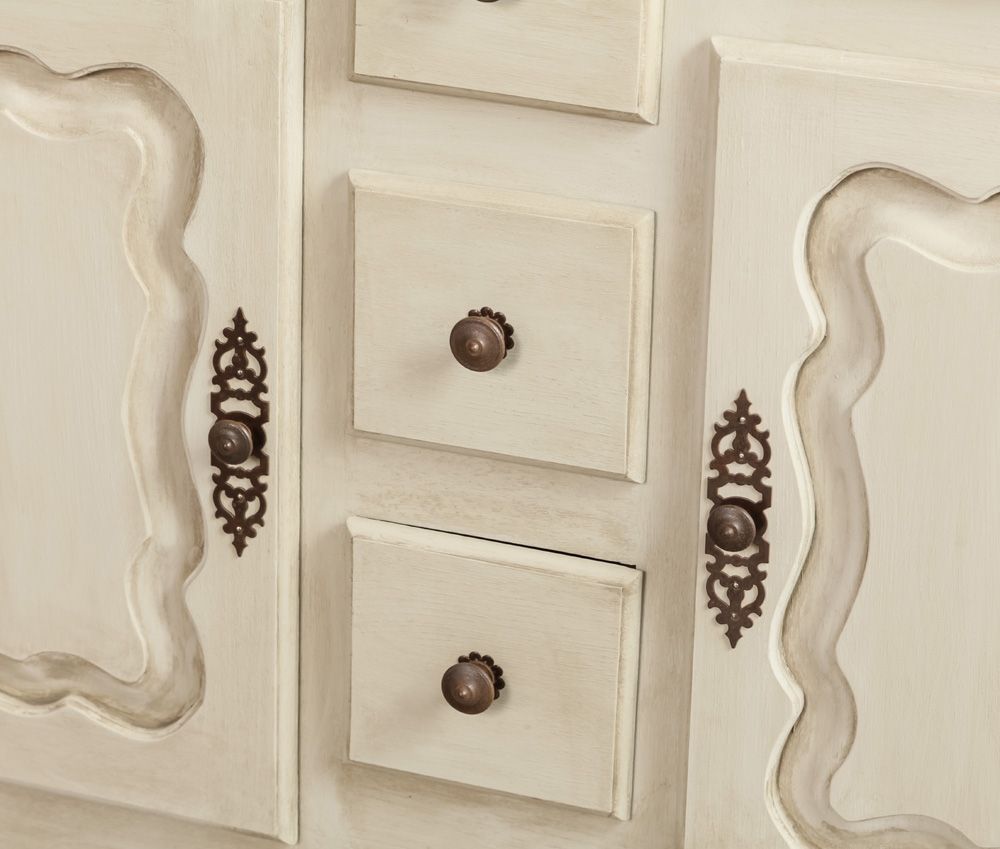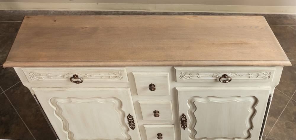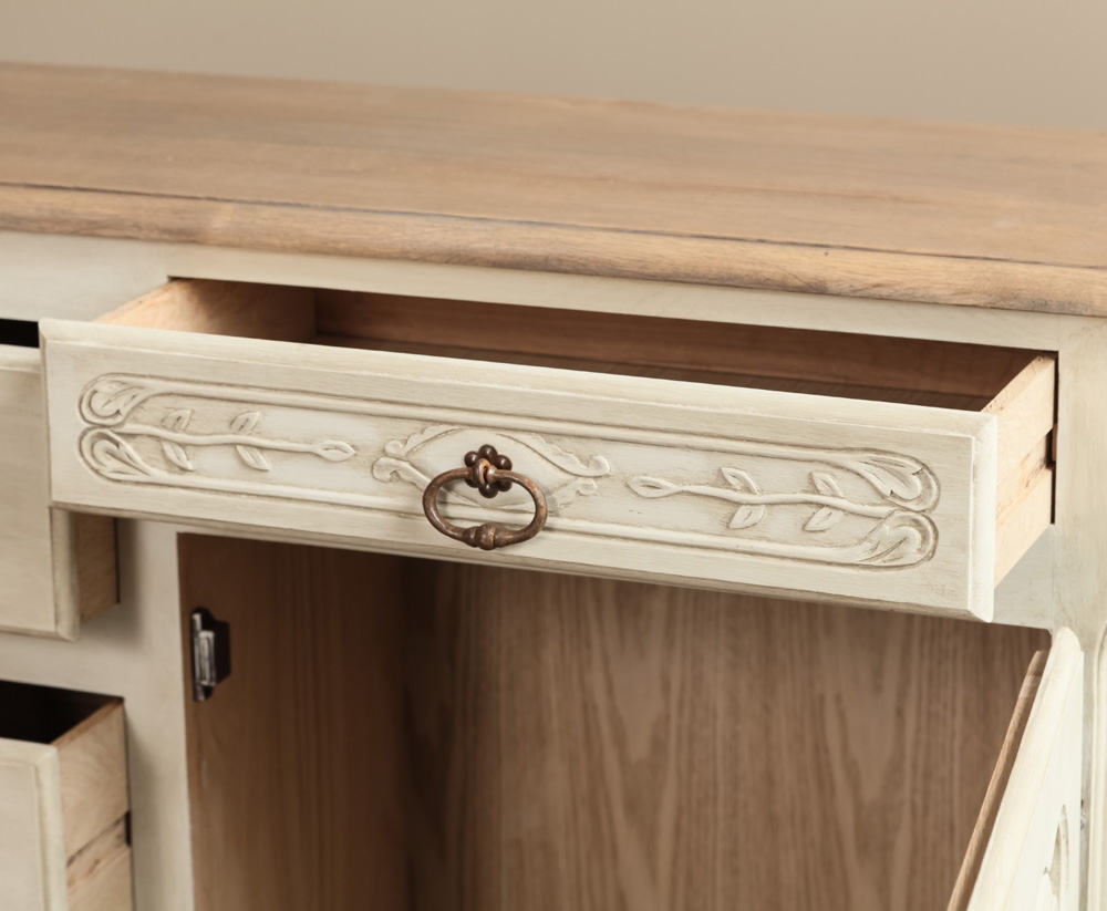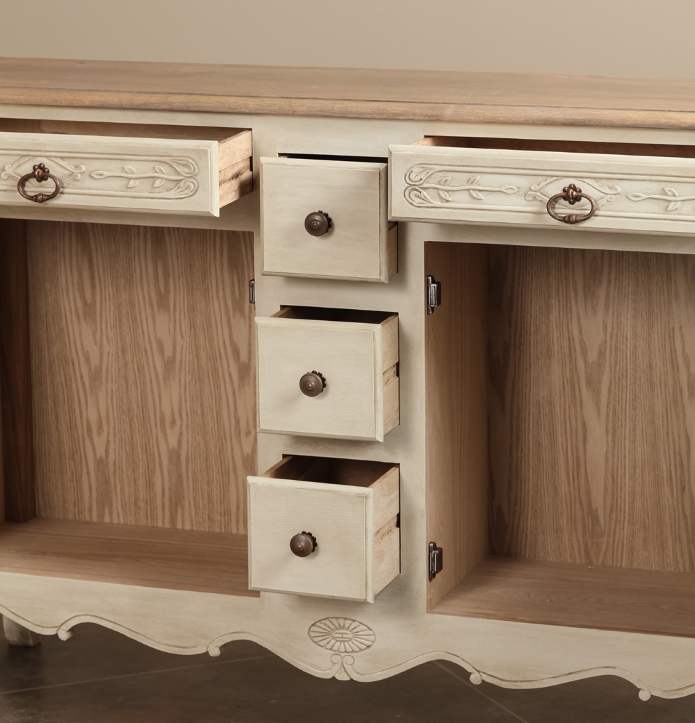 FINAL SALE! ~ Providing the perfect casual solution for today's dining areas and breakfast room, this buffet features a Country French charm with shallow depth yet a lot of storage behind the two doors and in the drawers. Subtly patinaed painted finish completes the look.