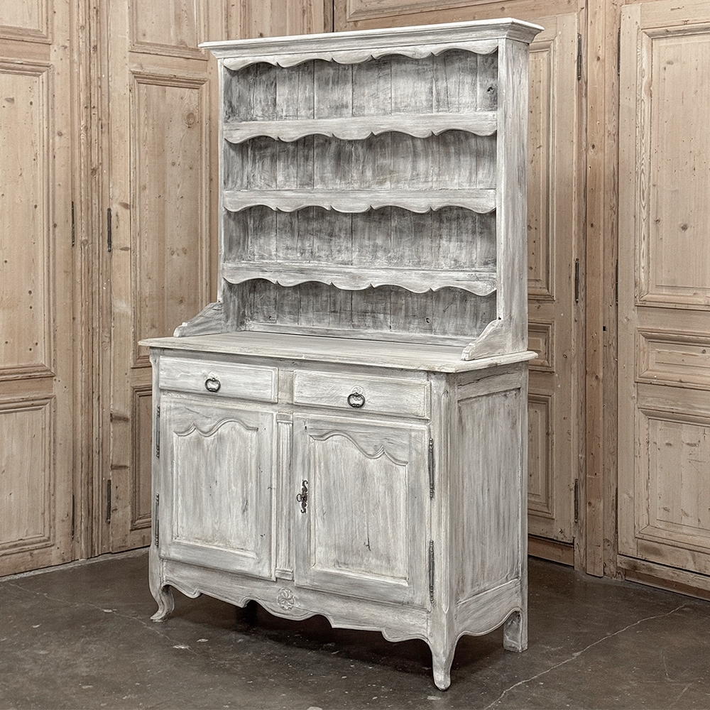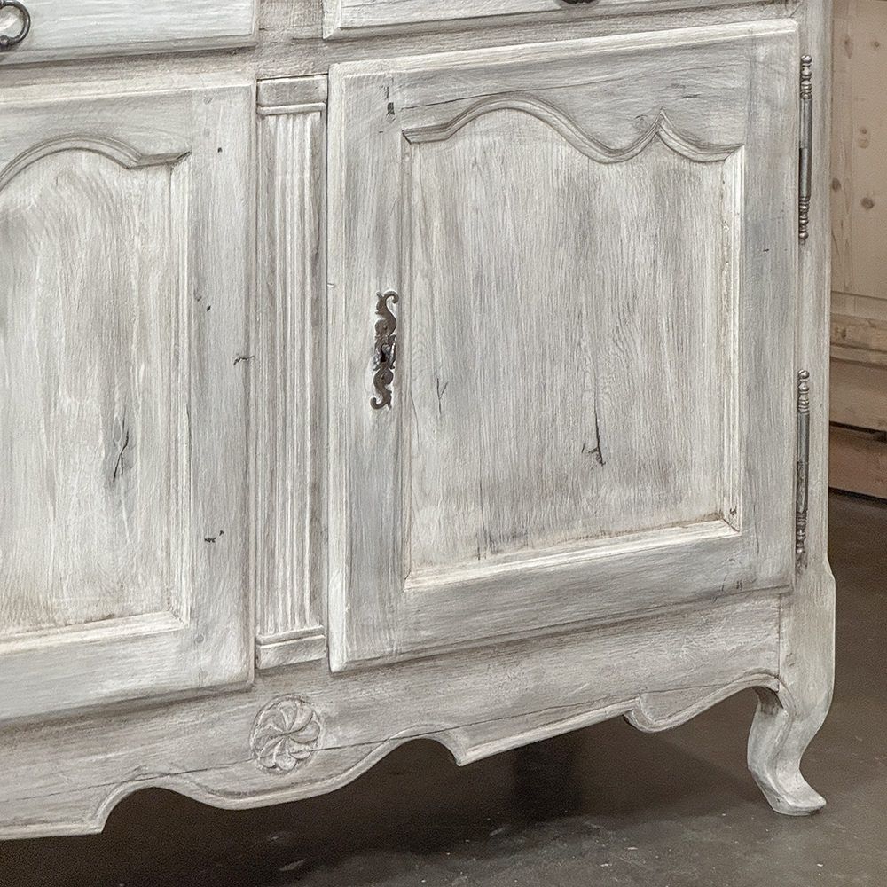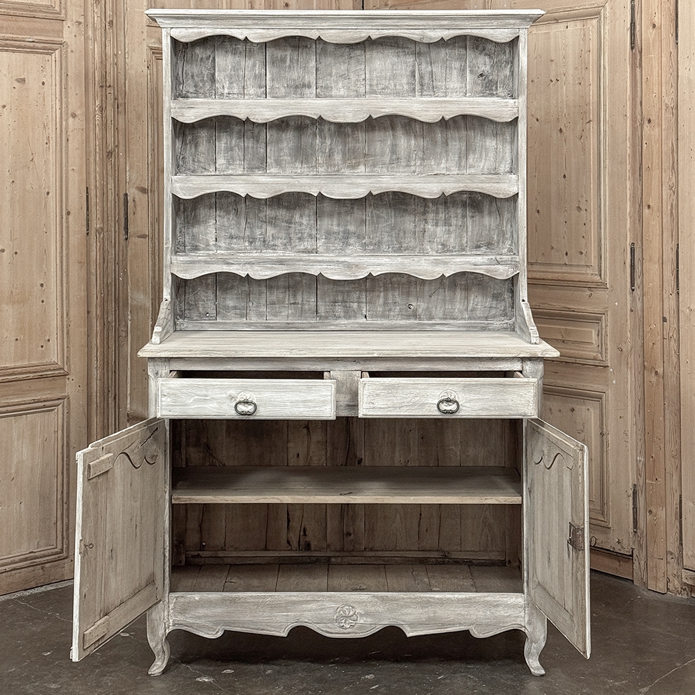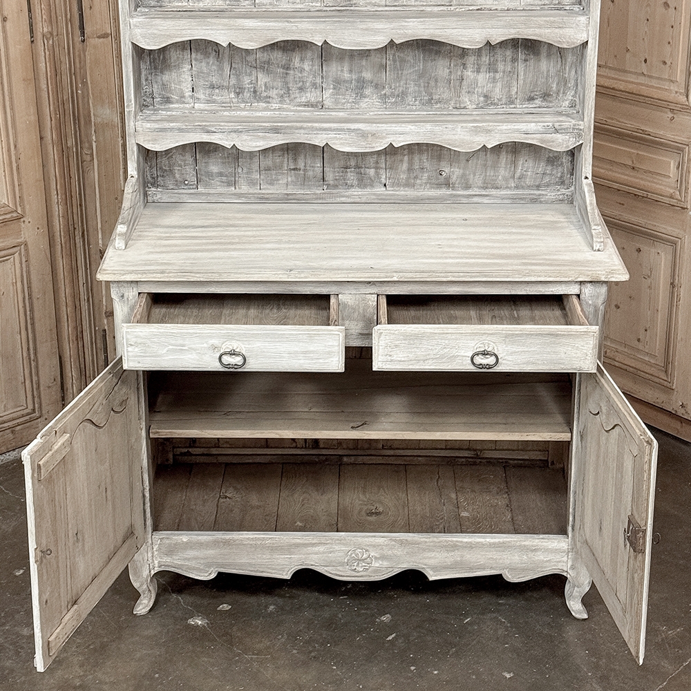 Sale19th Century Country French Whitewashed Vaisselier ~ Buffet ~ Cupboard is a classic design that will brighten up your kitchen or dining area with aplomb! Hand-crafted using time-honored techniques handed down from generation to generation, it features subtle carved details in the plate rack apron, cabinet door frame and lower apron with a single flower for visual appeal. Steel bale pulls and key guard add a nice accent, but the real visual appeal comes from the hand-applied whitewash finish that softens the look and makes it compatible with today's more casual decors. Doors and drawers open to reveal capacious storage, and one can display any family keepsakes on the top shelves, while still using the surface for anything from display to serving. Such pieces are VERY popular as coffee bars!
