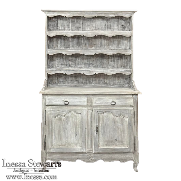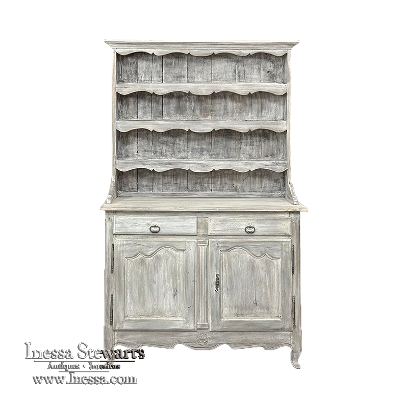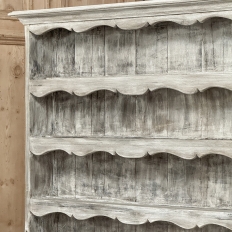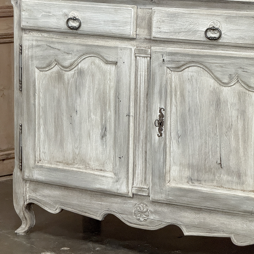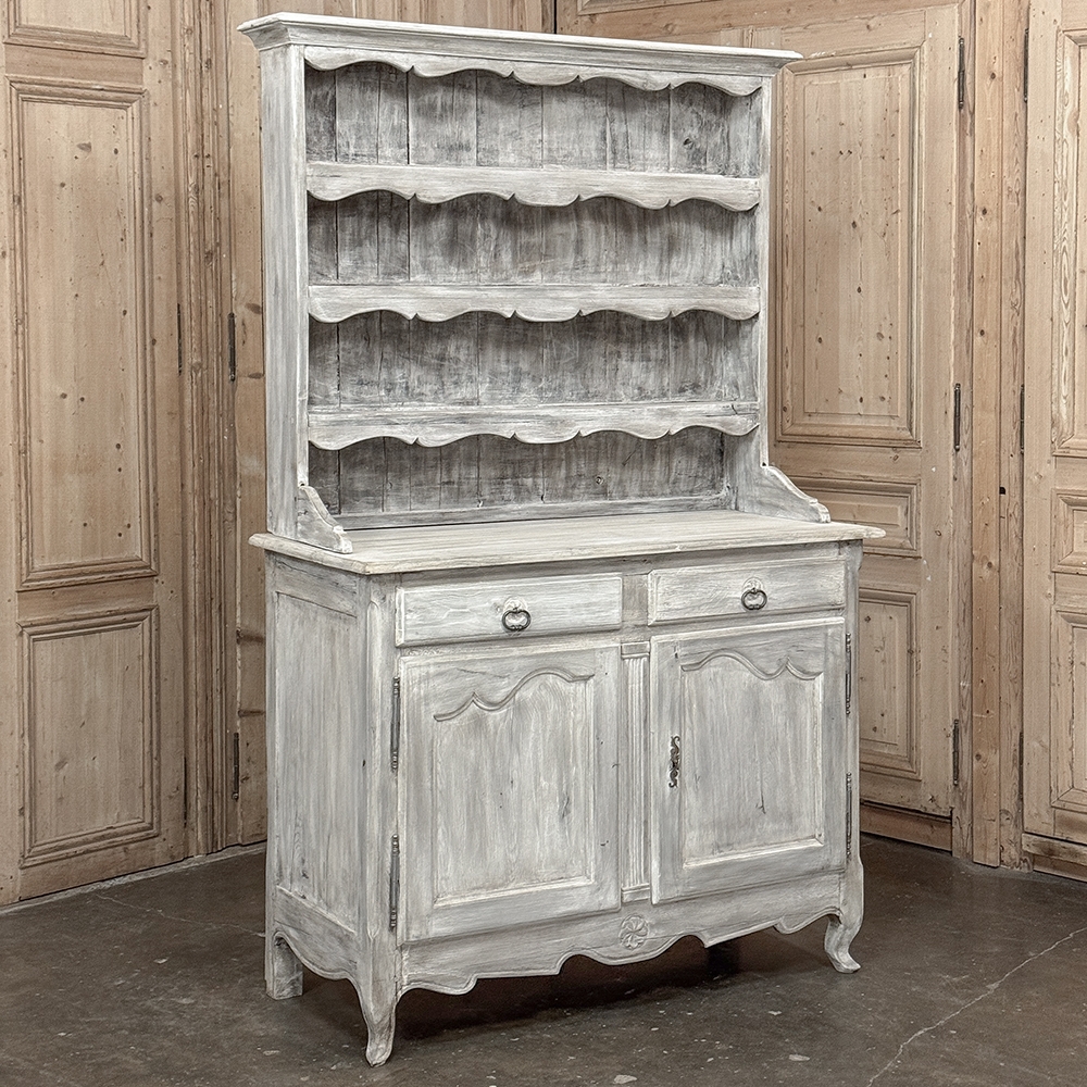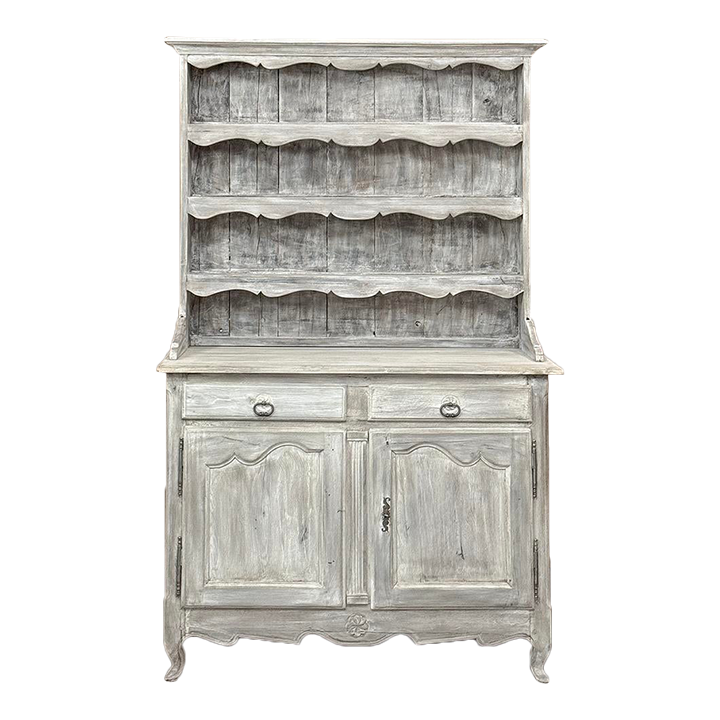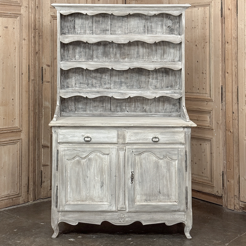 Sale19th Century Country French Whitewashed Vaisselier ~ Buffet ~ Cupboard is a classic design that will brighten up your kitchen or dining area with aplomb! Hand-crafted using time-honored techniques handed down from generation to generation, it features subtle carved details in the plate rack apron, cabinet door frame and lower apron with a single flower for visual appeal. Steel bale pulls and key guard add a nice accent, but the real visual appeal comes from the hand-applied whitewash finish that softens the look and makes it compatible with today's more casual decors. Doors and drawers open to reveal capacious storage, and one can display any family keepsakes on the top shelves, while still using the surface for anything from display to serving. Such pieces are VERY popular as coffee bars!