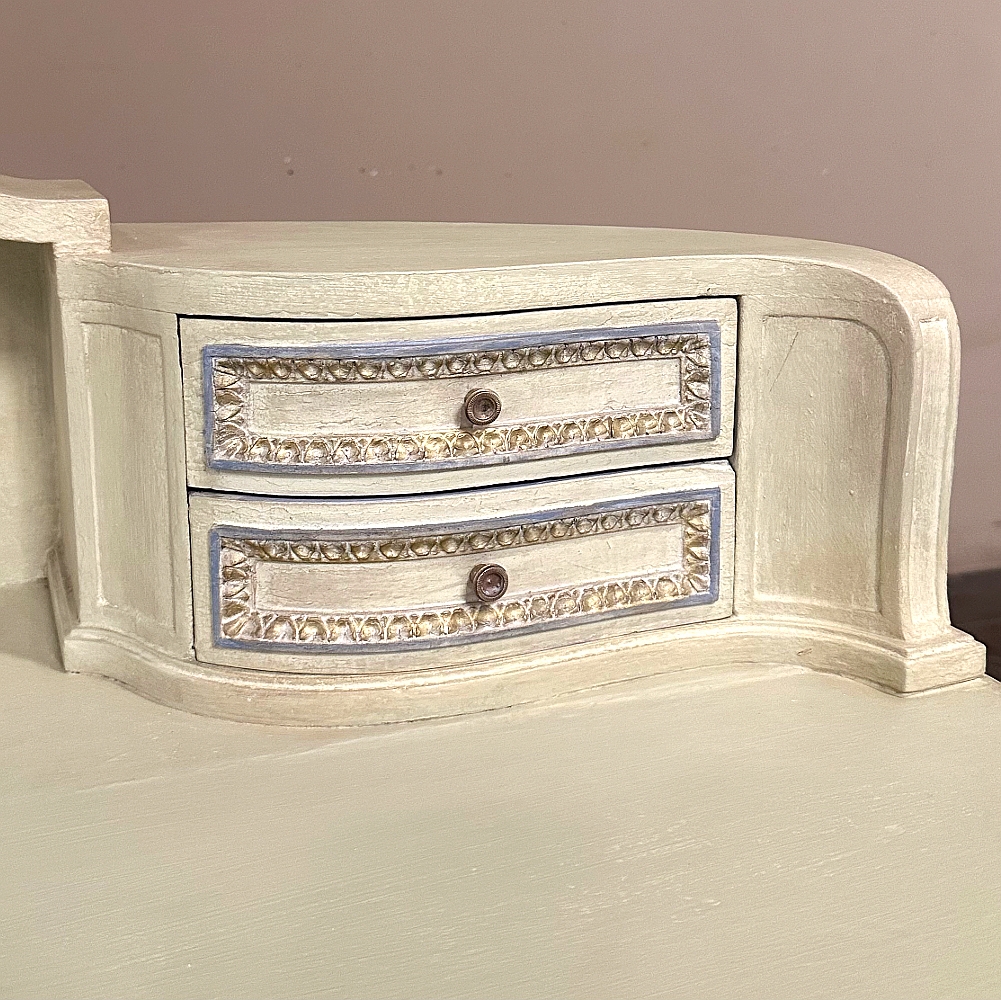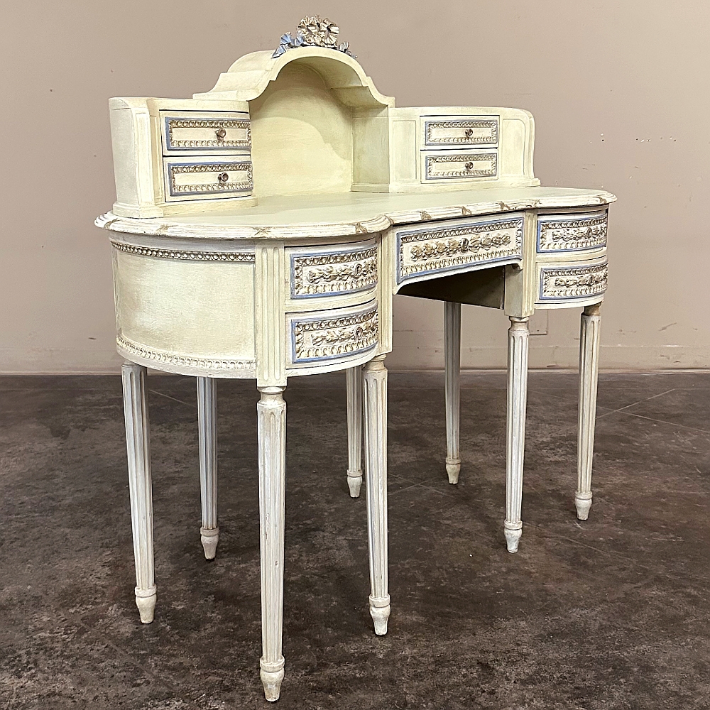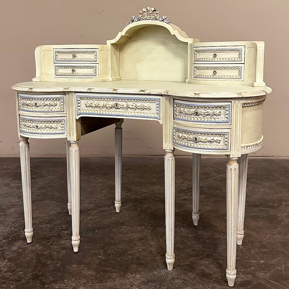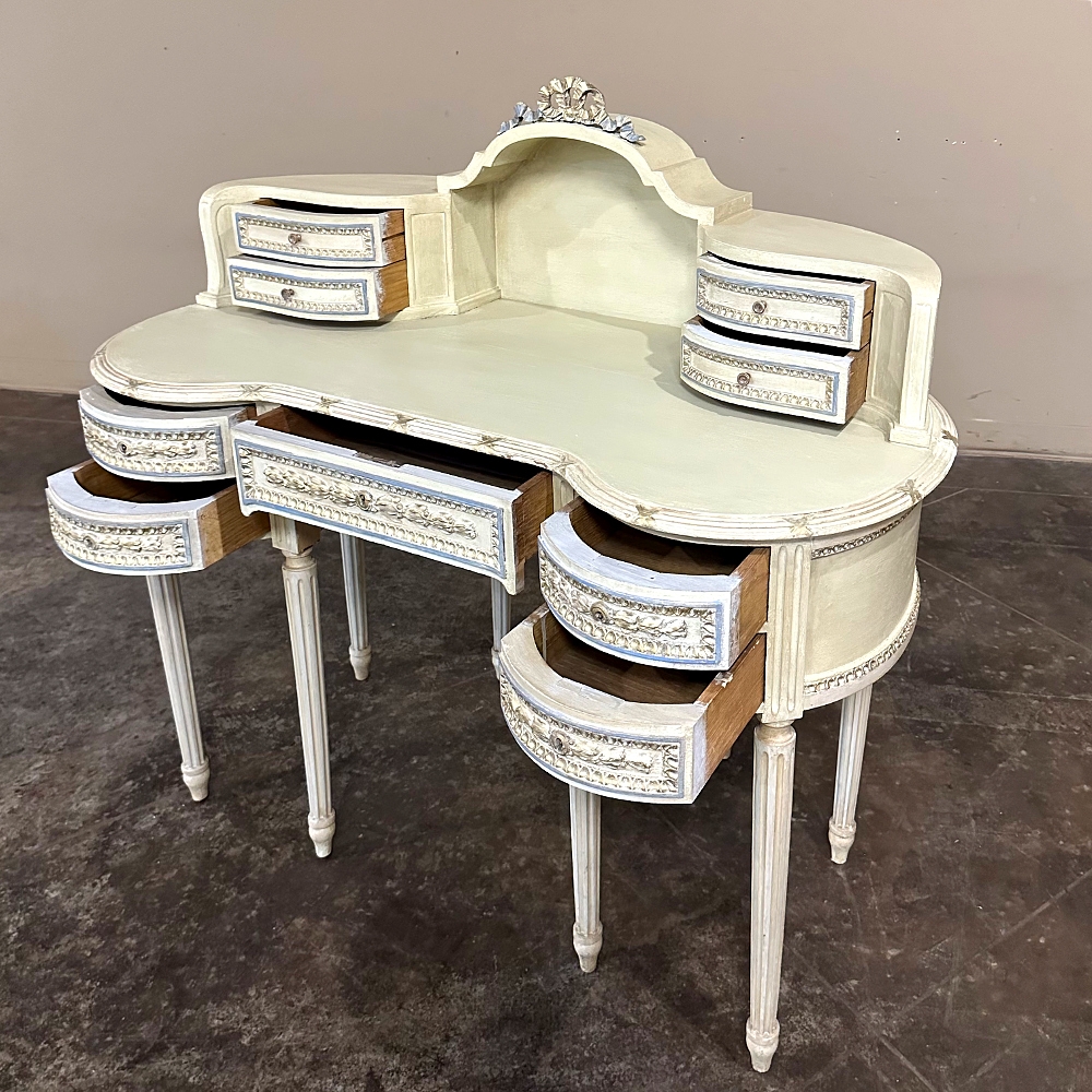 Antique Italian Neoclassical Painted Kidney-Shaped Vanity ~ Dresser will be the perfect finishing touch for your bedroom, or make a superlative student desk! Hand-crafted from fine hardwoods, it features a kidney shape with a scrolled, set-back upper tier containing a center arched cubby hole flanked by a pair of double drawers. Another pair of double drawers are designed into the lower casework, with a center drawer positioned higher to give the user a bit more knee room. All the drawers feature carved egg & dart bordering, with the lower tier drawers boasting additional relief carvings of laurel sprays. The two-toned painted finish highlights the carved detail and bordering, and has achieved a lovely patina over the decades. No less than eight tapered and fluted legs provide support to provide many more decades of enjoyment!